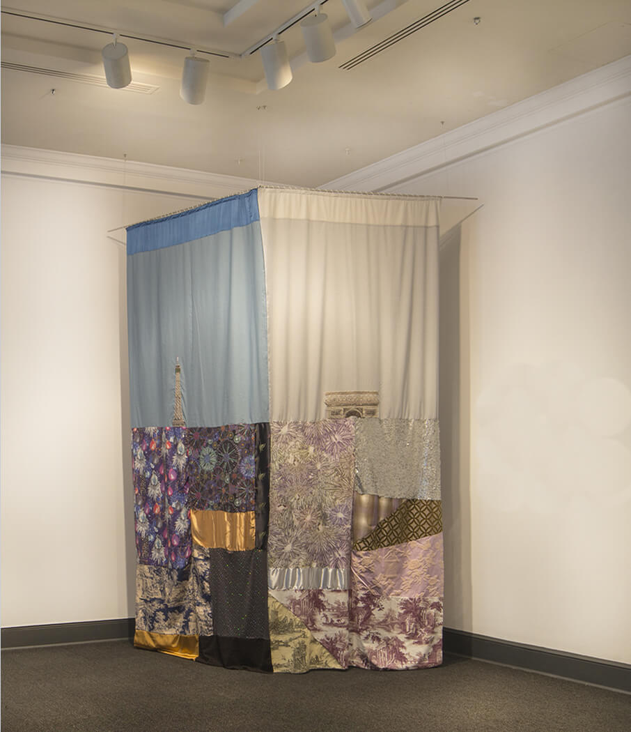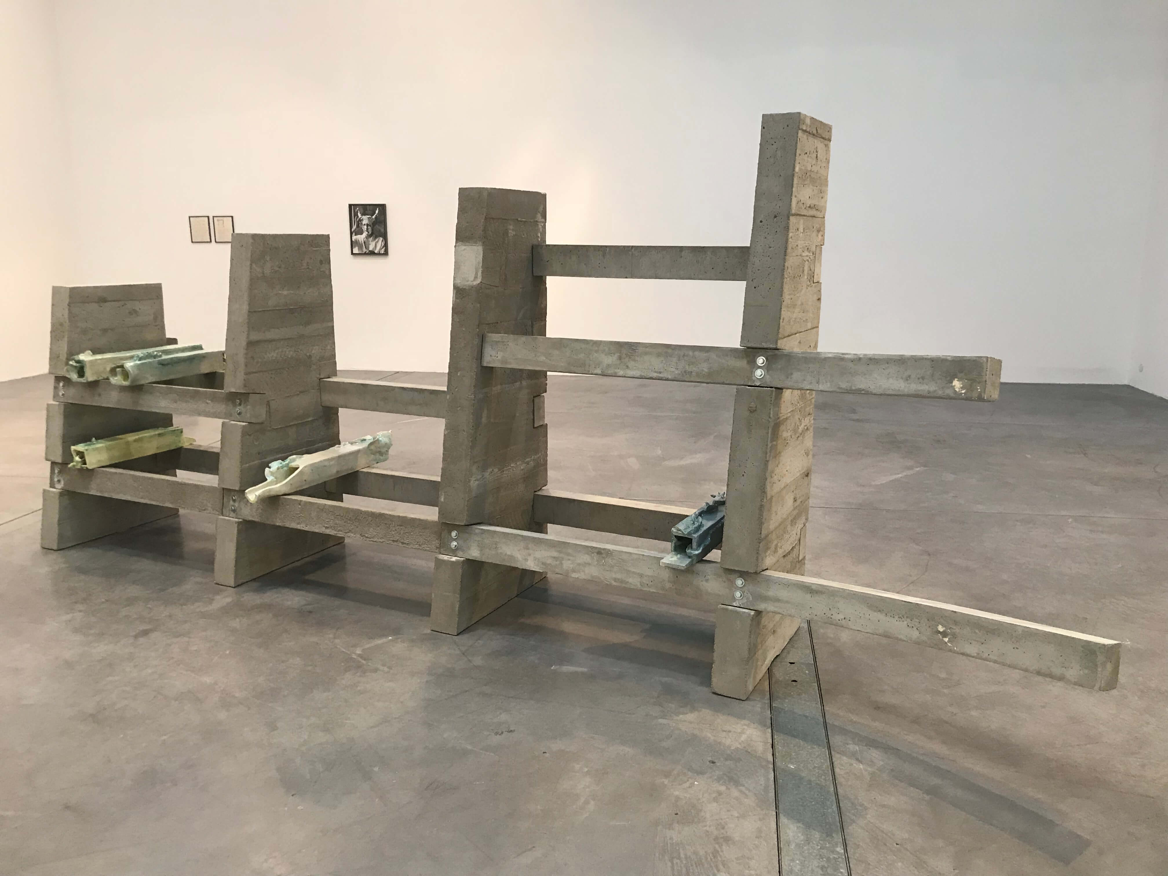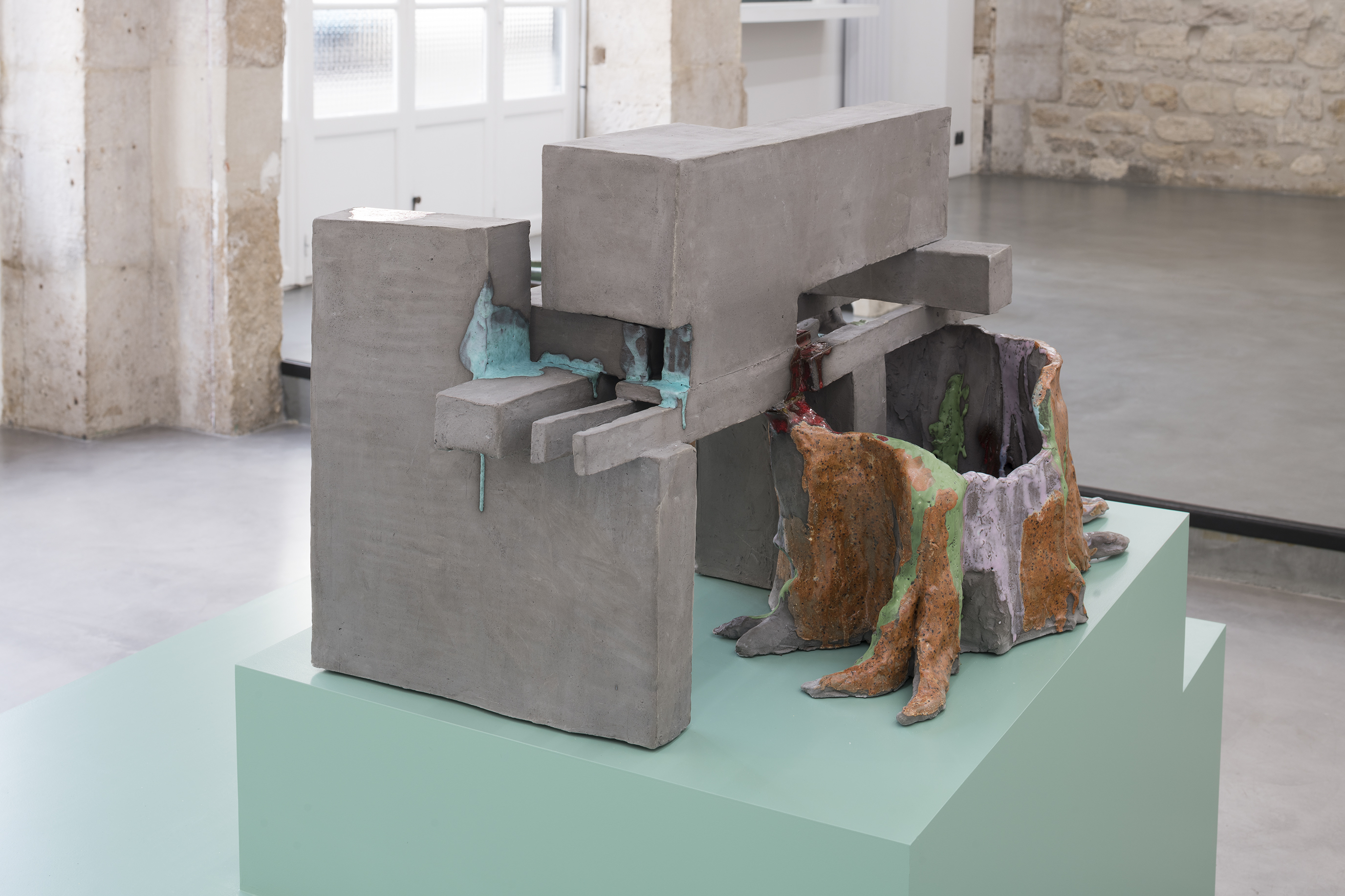 Le Corbusier, Mies van der Rohe, Norman Foster, Superstudio… Architectures which convey ideals, with the heavy responsibility of formalising theories, depicting utopias with wood, glass and concrete, and, above all, of placing them at a living, human scale: such is the basis of Isa Melsheimer’s reflections. However, she does not approach them from a nostalgic angle, but instead an analytic one, as though returning to the fundamentals, again and again, so as to extract the essence from them. Quite often, visions change into illusions, and this German artist’s work is not particularly optimistic. The materials lean more often towards fineness: textiles, which are clearly present, do not come over as conquerors, but instead as worn objects — mattresses, tee-shirts, etc. — with an apathetic limpness; veils and curtains no longer embody the theatricality they are often relegated to, while paint appears in its washed-out form of watercolours. When concrete or ceramics do come into play, this is always in a reduced format, as objects or models, as if the artist were denying their greatness.