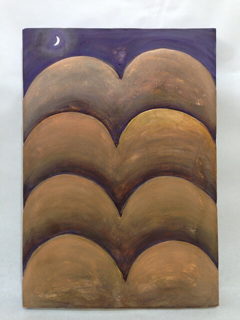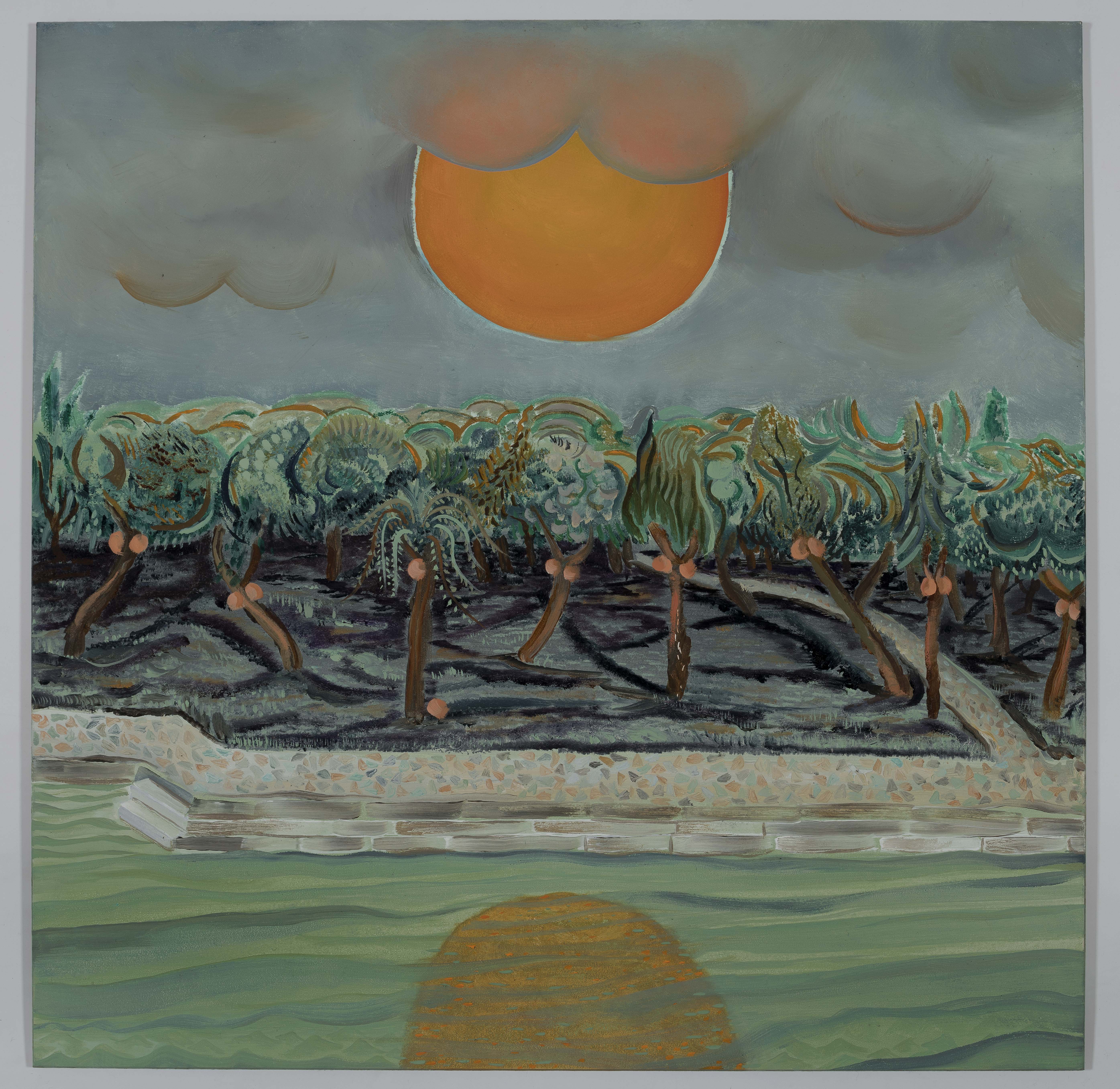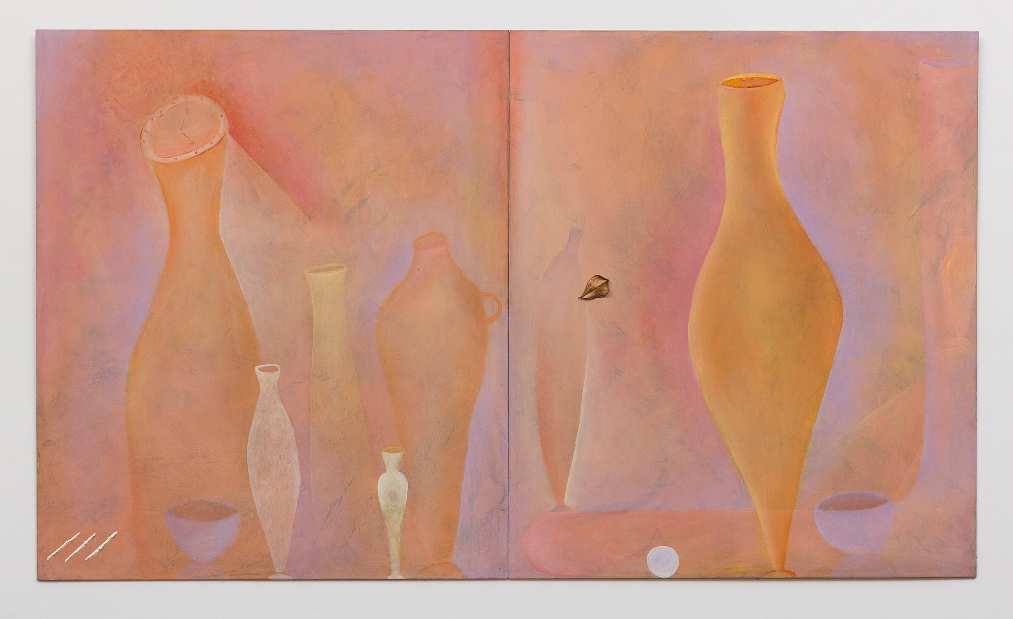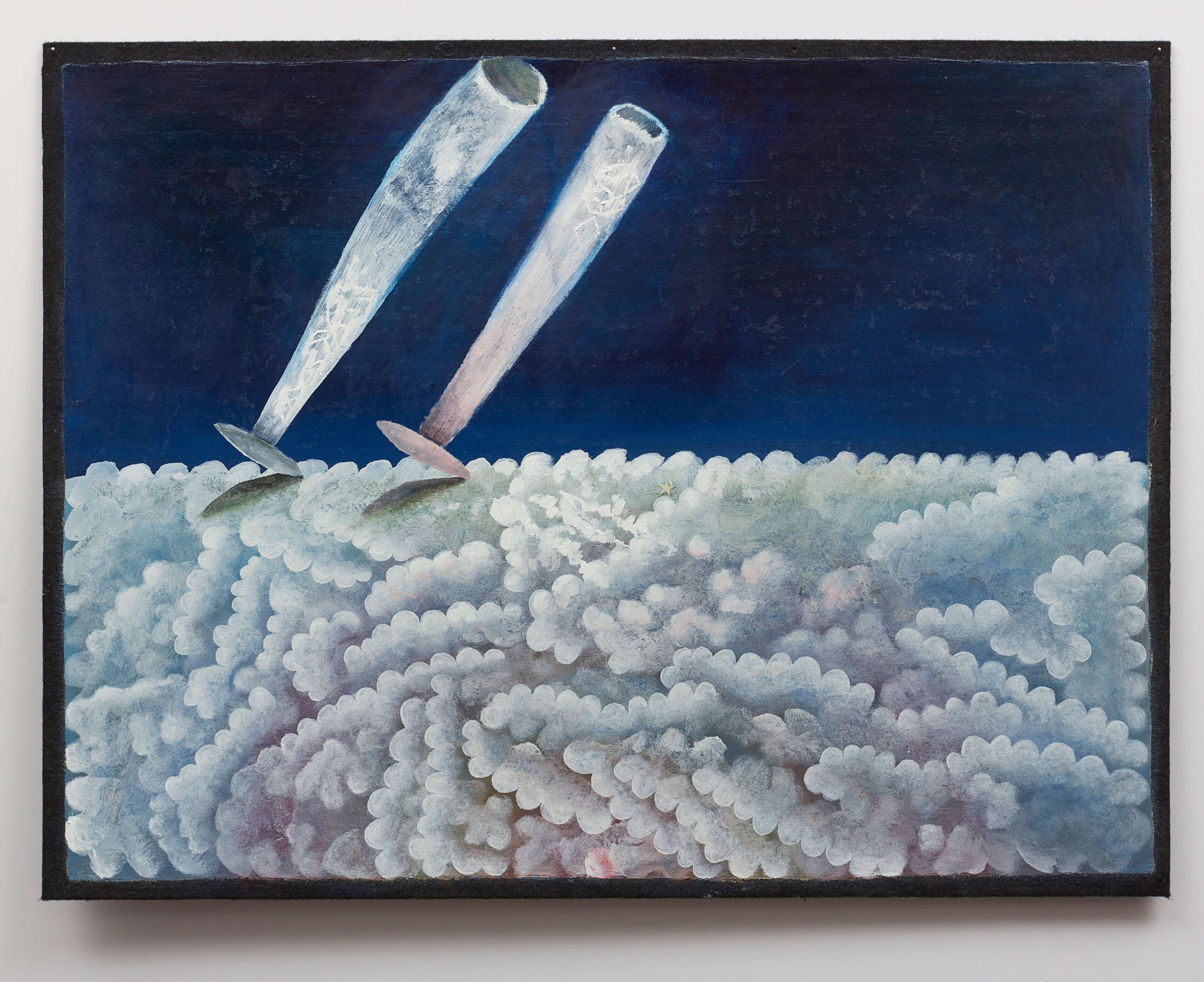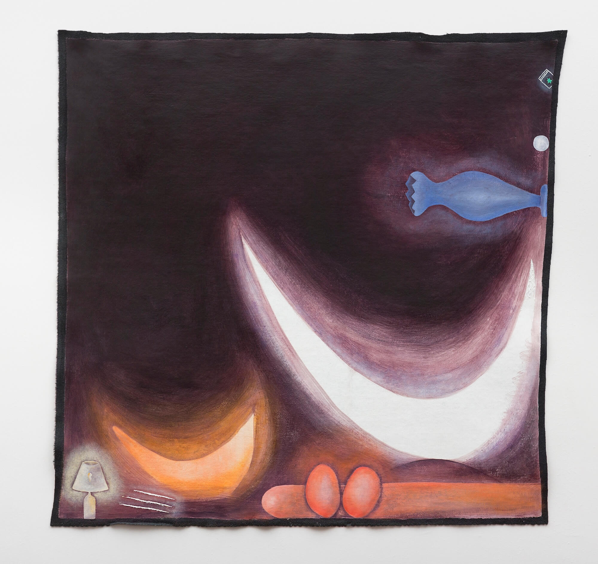 Santiago de Paoli's painting might seem surprising to the viewer. At first glance, the artist appears to be representing a number of common themes and elements, such as moons, candles, lamps, socks, g-spots, nuts, flowers and skies with clouds. But his work requires being contemplated through a feeling of curiosity, allowing the visitor to discover a personal view. Despite the varied and sometimes unusual materials the artist adapts to create his compositions, the economy of means and personal choice of aesthetic formalisms ties the work together, with a disruptive sense of humour and a childlike innocence.
