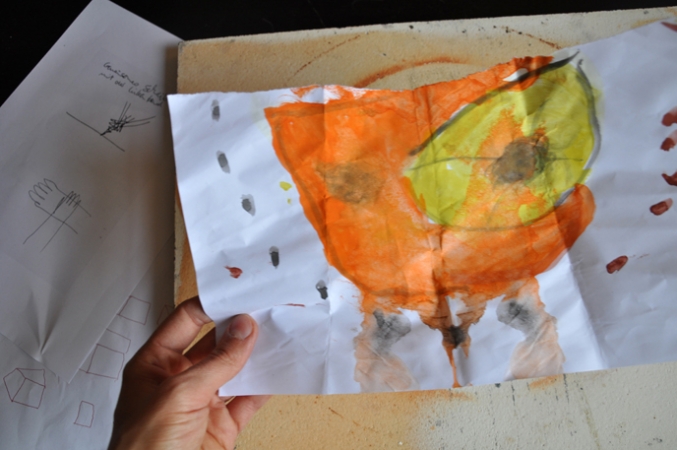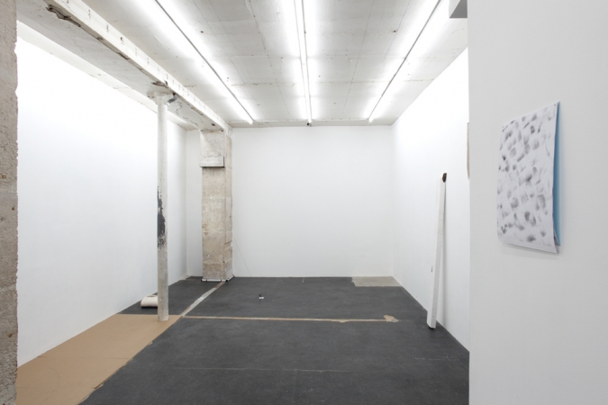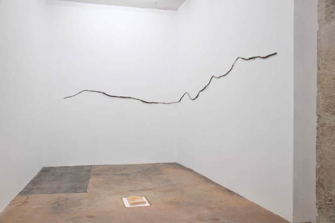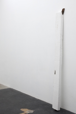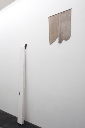 > Einsicht , 2009, Stone, wood, plaster, cloth, nails; door: 215 x 82 x 2 cm; stone: 48 x 30 x 20 cm >séparer, partager, 2009,Digital print on paper,1 image = 100 posters,one poster : 42 x 30 cm, full image size: 120 x 1000 cm, Protocole Le Lit, 2009, wood, plaster, 200 x 15 x 7 cm > Correspondances, 2009, leather, 68 x 48 cm