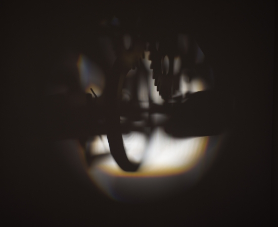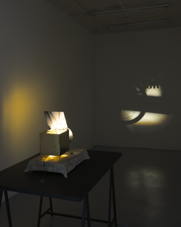 Lantern (clock), Inventio in dies subtilior, 2014, Wooden table, metal easels, bronze, brass, electrical devices, optical devices, clock mechanism, 120 x 90 x 120 cm