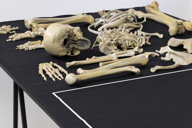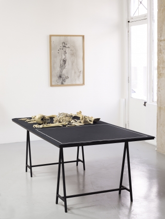 Gigante, 2014, Wooden table, metal easels, serigraphed canvas, oil painted bronze, 220 x 110 x 90 cm