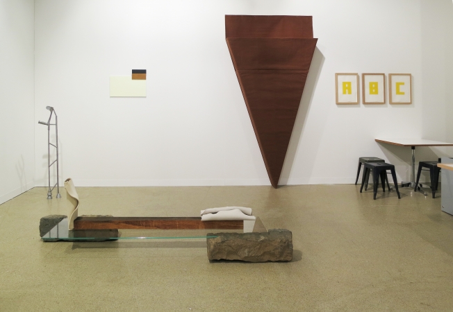 Franz Erhard Walther, Form V, 1994, Cotton fabric, foam. Without title, A, B, C, 2016, Pencil, watercolour on paper. Guillaume Leblon, Le prince des poètes, 2016, Lime tree wood, insulating polyester, painted metal. Francisco Tropa, Antipodes, 2015, Plexiglas, brass, stone, electric wire, light bulb. Franz Erhard Walther, Inhalt, 1958, Pencil and gouache on thin cardboard. Franz Erhard Walther, Form R, 1994, Cotton fabric, foam, wood.