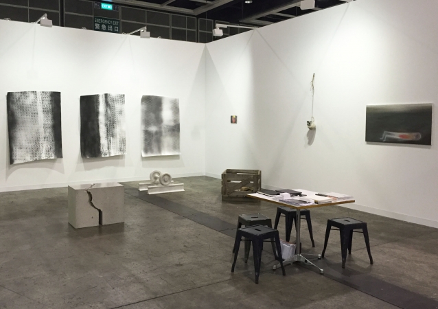 Colette Brunschwig, Pochoir 3, 2010, Indian ink on paper, Pochoir 4, 2010, Indian ink on paper, Pochoir 5, 2010, Indian ink on paper. Christoph Weber, Untitled (Gegenstück), 2015, Concrete. Francisco Tropa, Antipodes, 2015, White Estremoz marble. Untitled (TSAE - Chambre violée), 2011, Wooden box, stones, bronze stones with tree different patines. Vanitias, 2014, Painted bronze, string. Miriam Cahn, herumliegen, 13.04.2006, Oil on canvas.