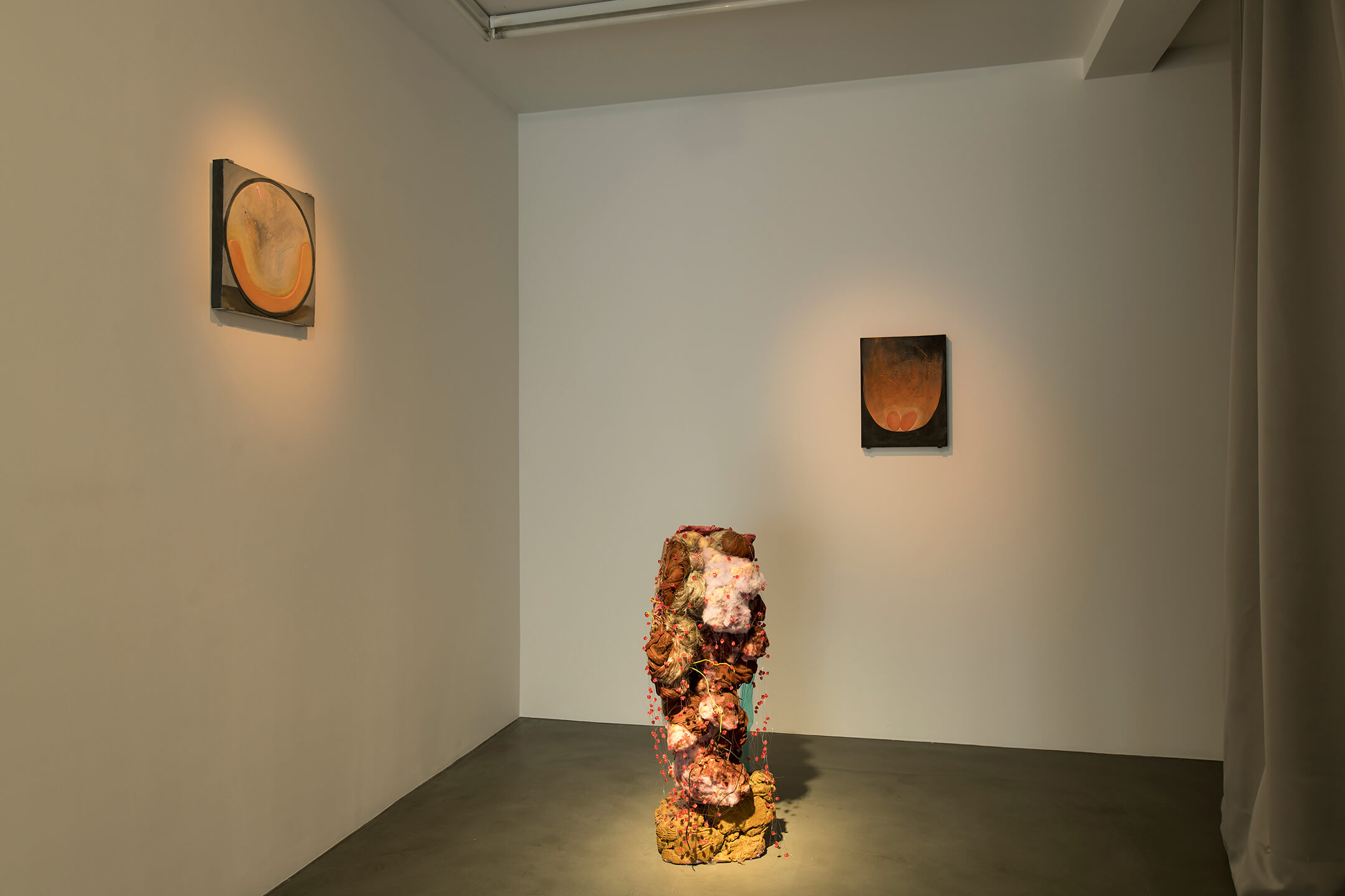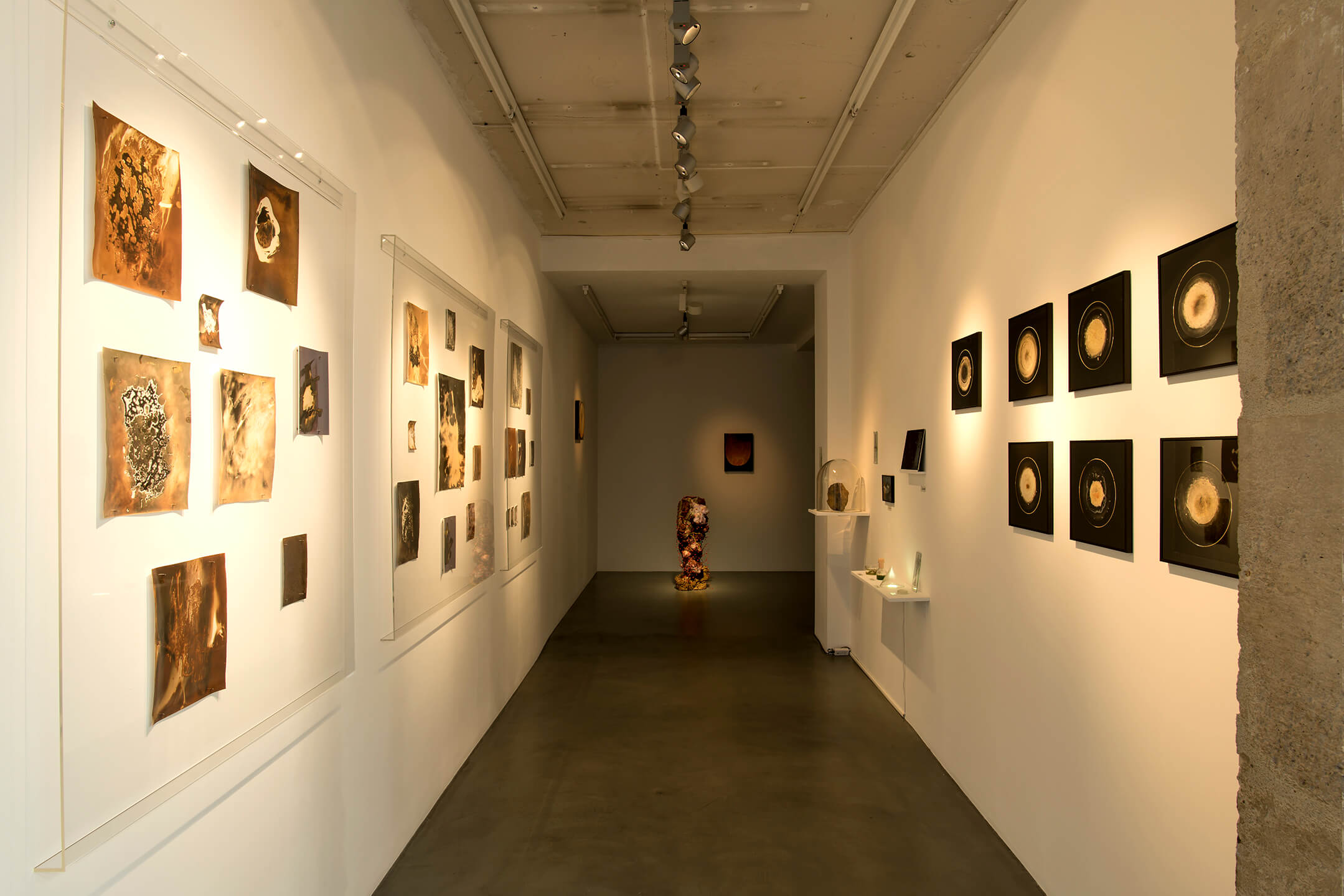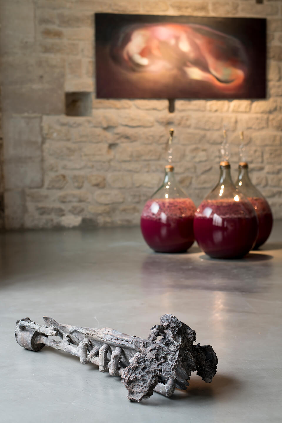 Francisco Tropa, Arenaire, 2014, Etching ink on Paper velin d'arches 300gr (Monotype), 54 x 53 cm (each). Katinka Bock, Kelvin and Clyde, 2018, copper, bronze, dimensions variable. Hilario Isola Enrico Ascoli Strawberry Fields Forever 1, 2018, fermented fruit on wooden panel, 74.5 x 151 cm. Ph. François Doury