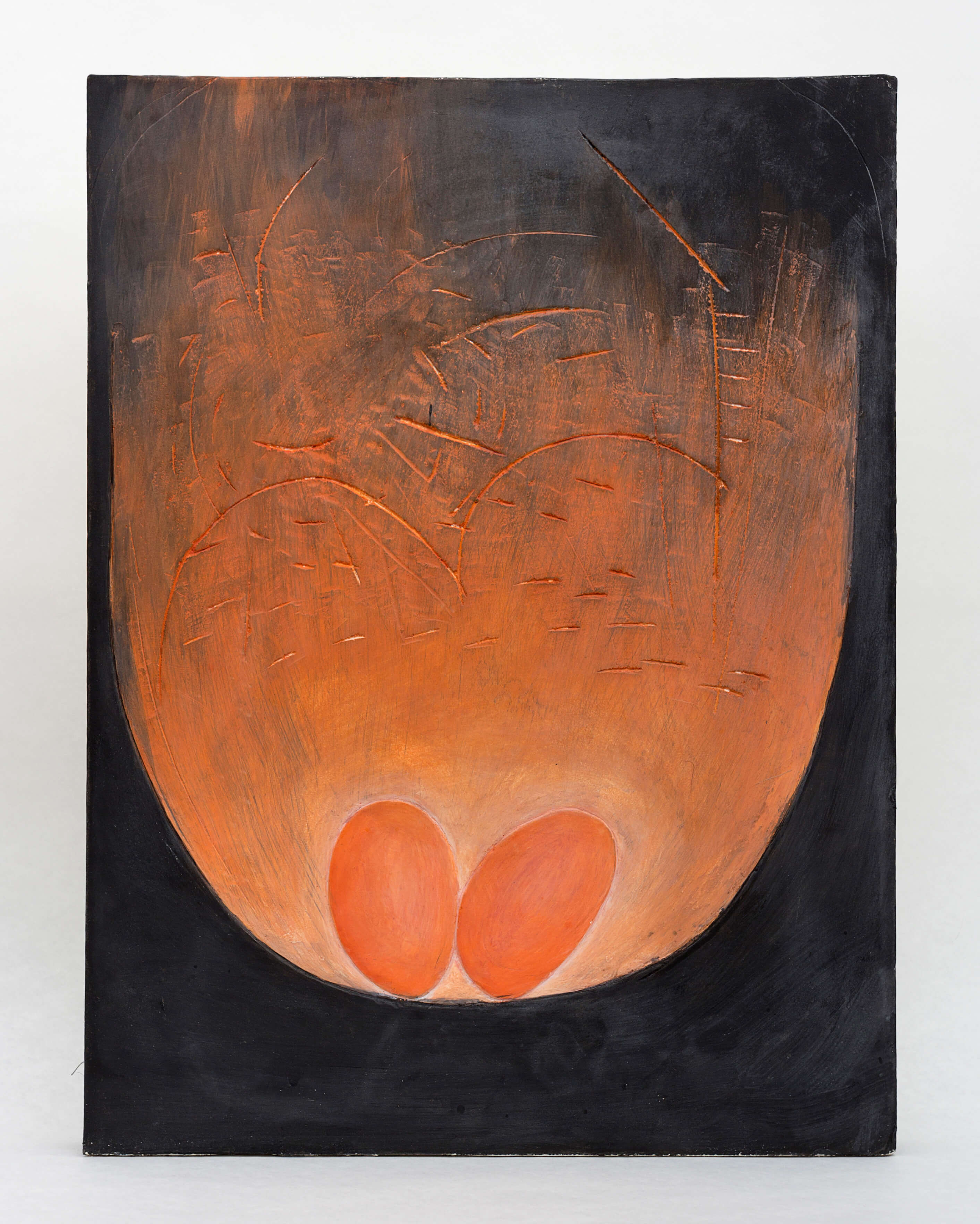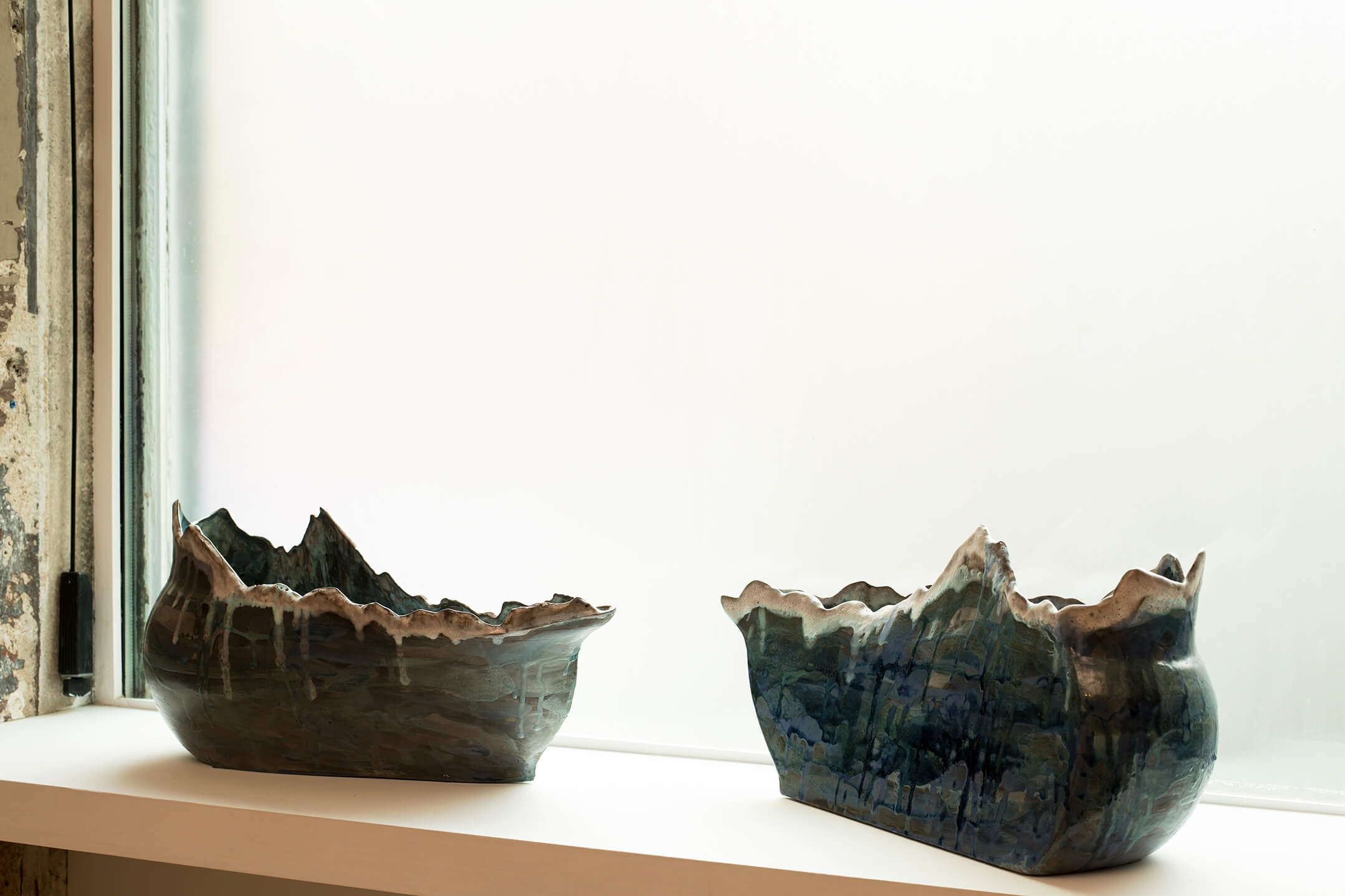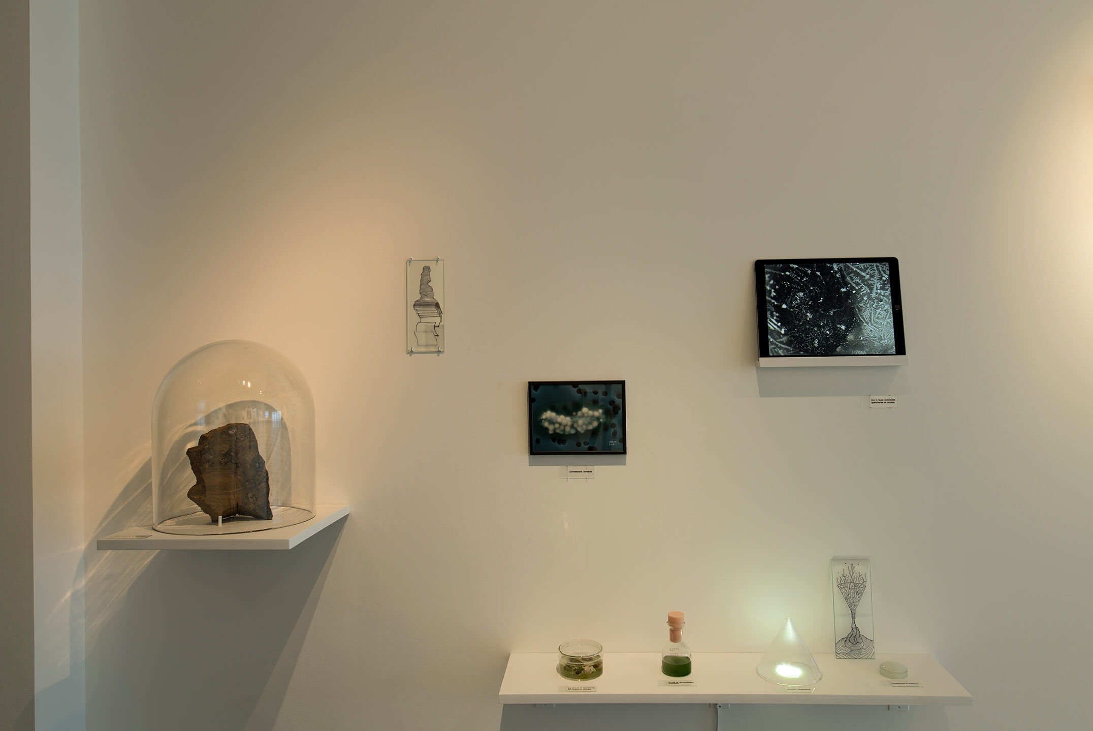 Francisco Tropa, Arenaire, 2014, Etching ink on Paper velin d'arches 300gr (Monotype), 54 x 53 cm (each). Katinka Bock, Kelvin and Clyde, 2018, copper, bronze, dimensions variable. Hilario Isola Enrico Ascoli Strawberry Fields Forever 1, 2018, fermented fruit on wooden panel, 74.5 x 151 cm. Ph. François Doury