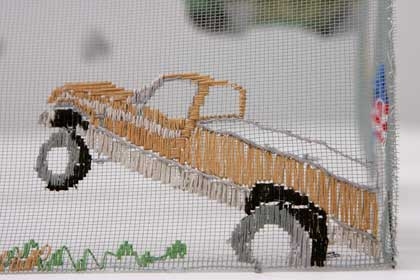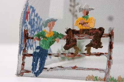 Isa Melsheimer > Unfinishedbuilding (detail)> 2005 > metal fly screen, thread > 32x32x20 cm