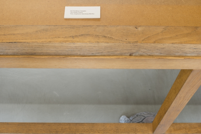 Hans Schabus, Die feindlichen Gewalten, 2016, showcases from the Beethoven frieze at Secession building, concrete, shoes, 270 x 311 x 201 cm, (detail)