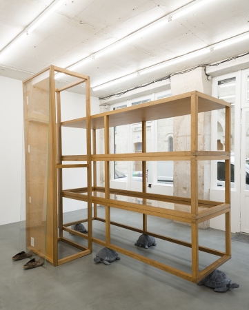 Hans Schabus, Die feindlichen Gewalten, 2016, showcases from the Beethoven frieze at Secession building, concrete, shoes, 270 x 311 x 201 cm