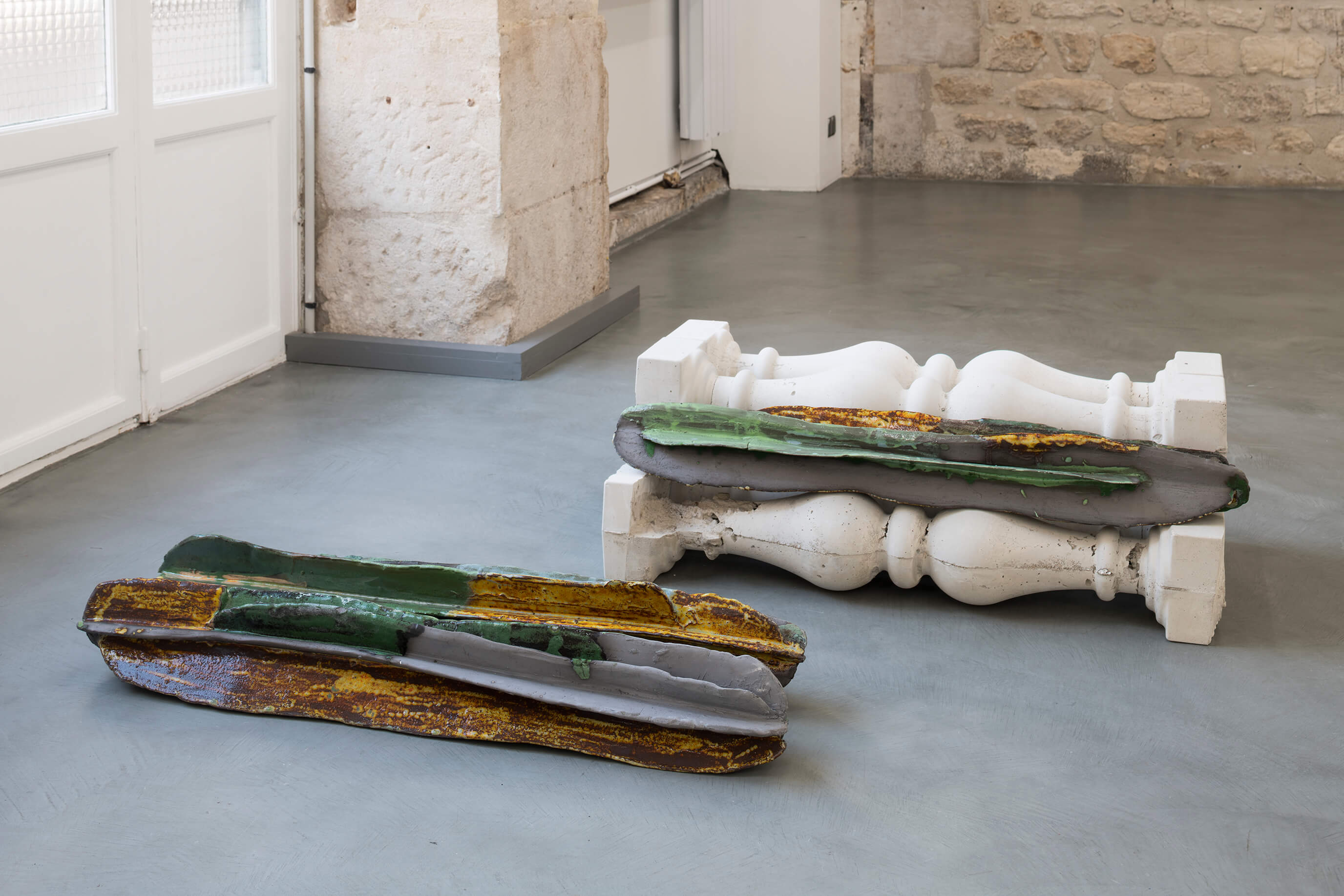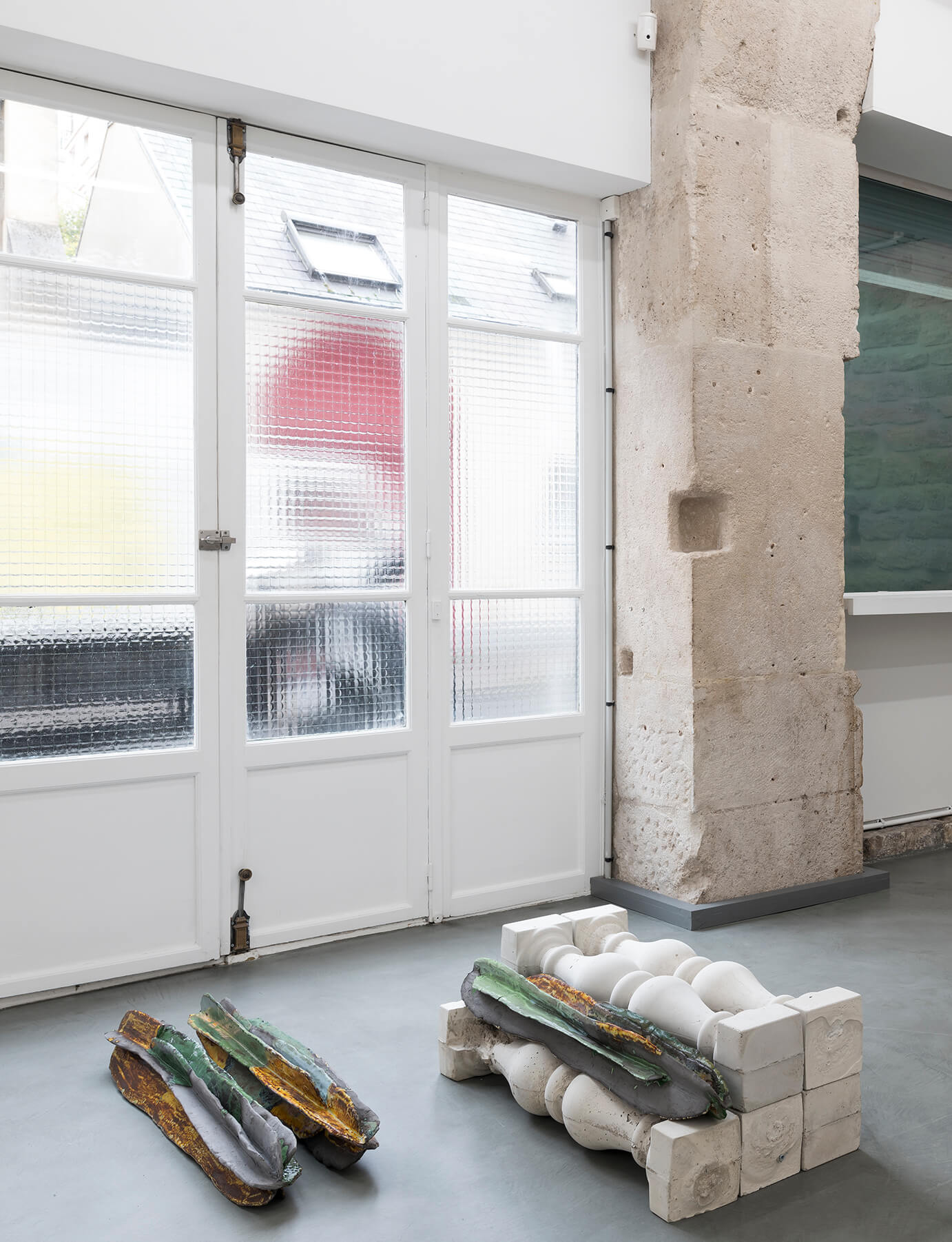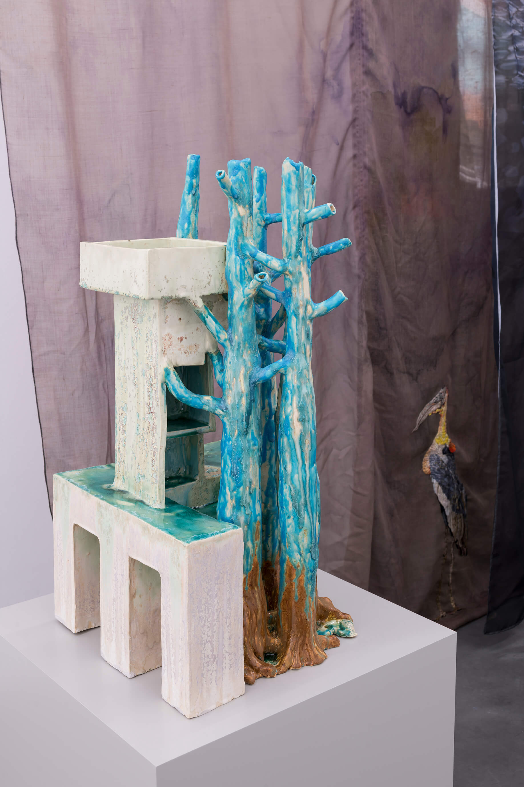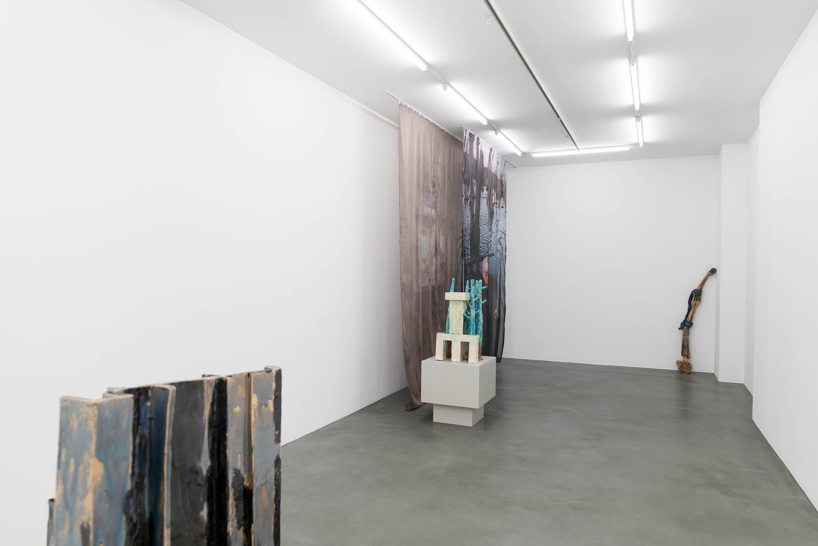 Isa Melsheimer, Vorhang (Slothrop), 2019, printed fabric, fabric, threads, unique, 300 x 350 x 30 cm; Peene Valley, 2019, ceramic, unique, 71 x 37 x 35 cm; Afterlife, 2019, ceramic, unique, 52 x 42 x 35 cm (from front to background). View of the exhibition 'Metabolic Rift' ate Galerie Jocelyn Wolff Paris - Belleville, 2019 (photo: François Doury).