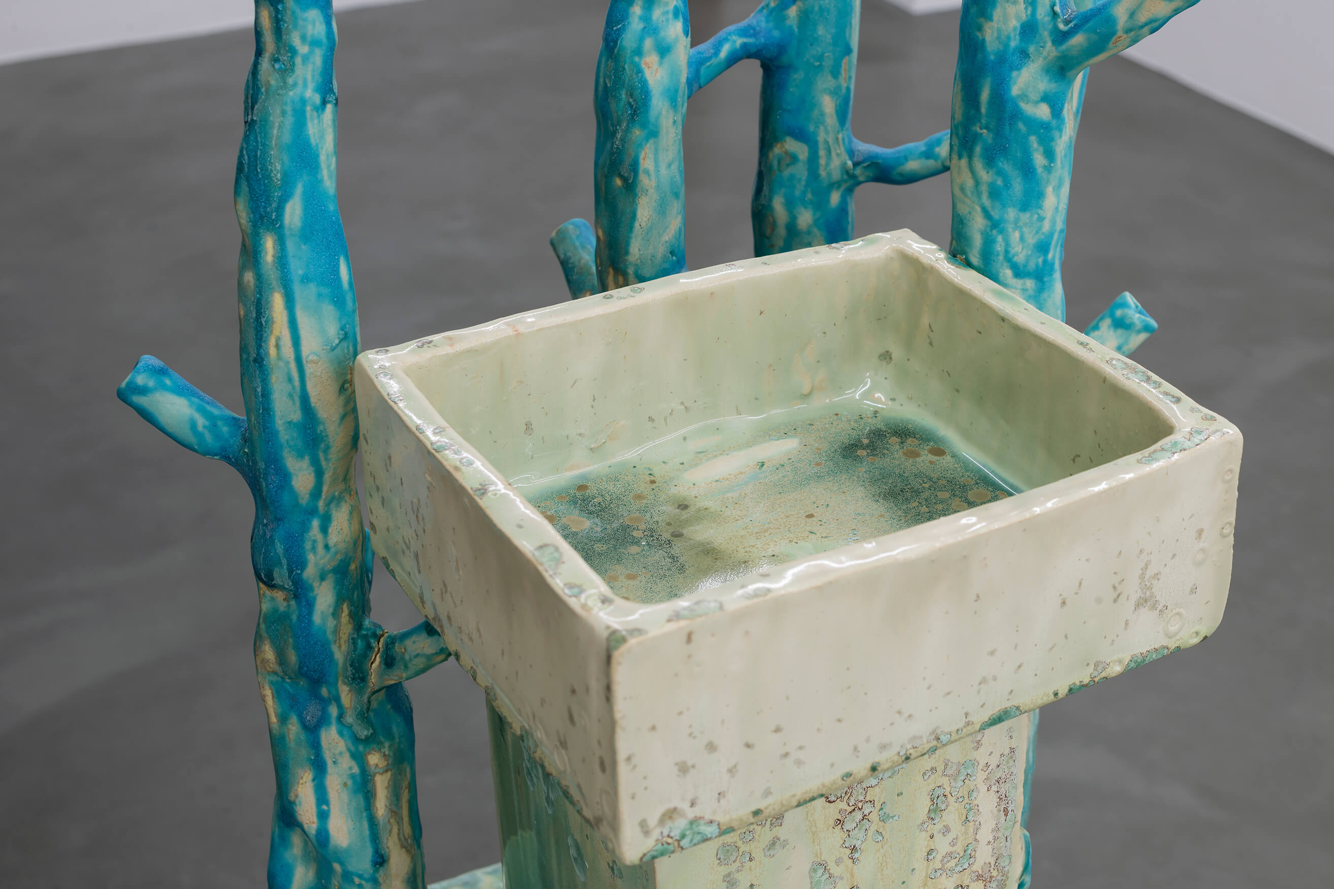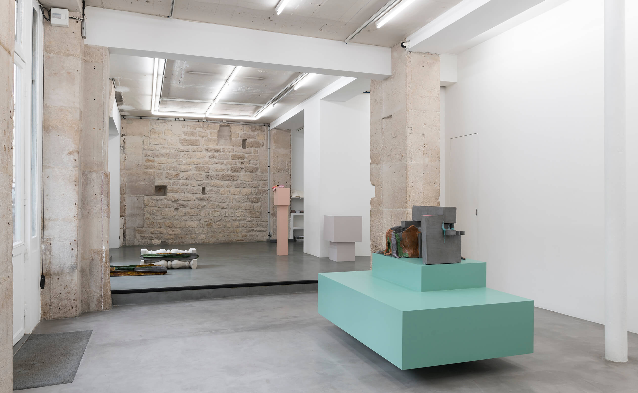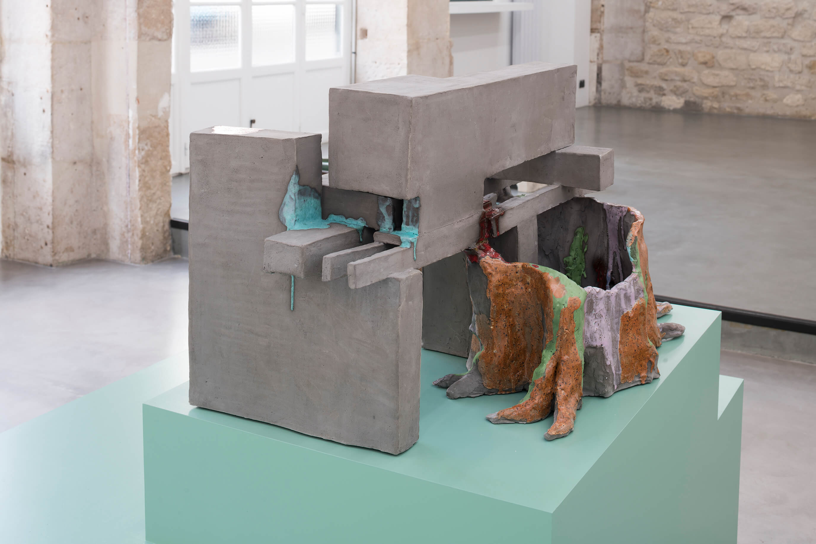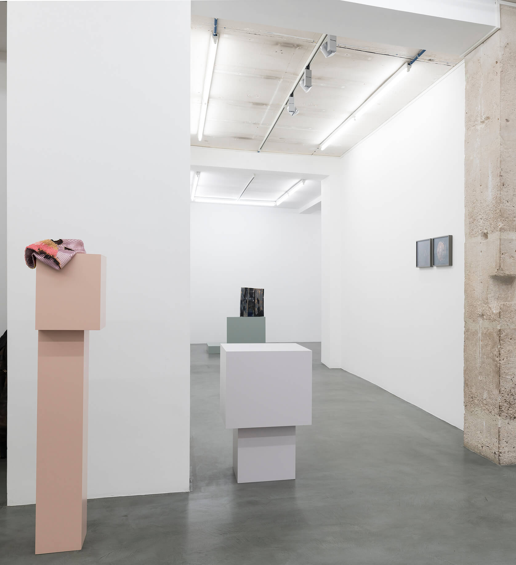 Isa Melsheimer, Vorhang (Slothrop), 2019, printed fabric, fabric, threads, unique, 300 x 350 x 30 cm; Peene Valley, 2019, ceramic, unique, 71 x 37 x 35 cm; Afterlife, 2019, ceramic, unique, 52 x 42 x 35 cm (from front to background). View of the exhibition 'Metabolic Rift' ate Galerie Jocelyn Wolff Paris - Belleville, 2019 (photo: François Doury).