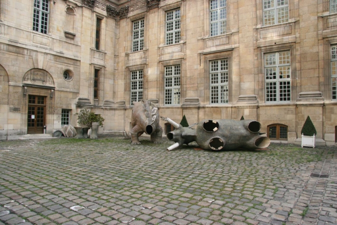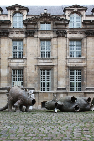 Stegosaurus: 285 (H) x 195 (W) x 600 (D) cm; 3 scales; Mammouth: 280 (H) x 150 (W) x 515 (D) cm; 3 legs; 1 ear"