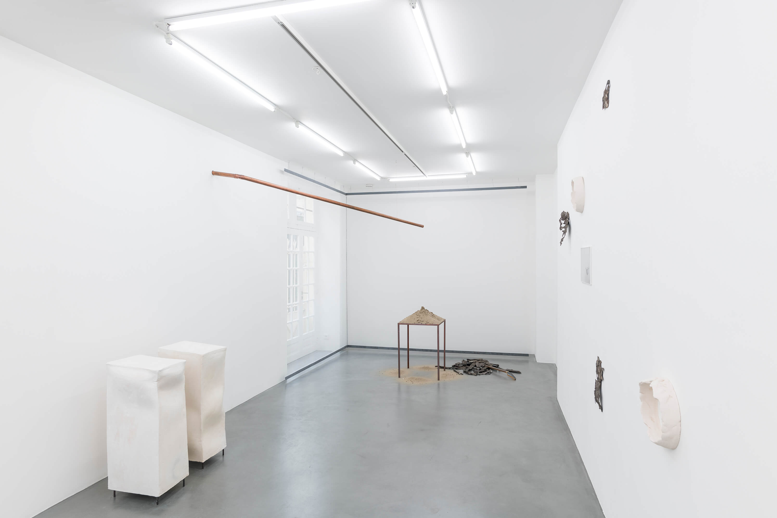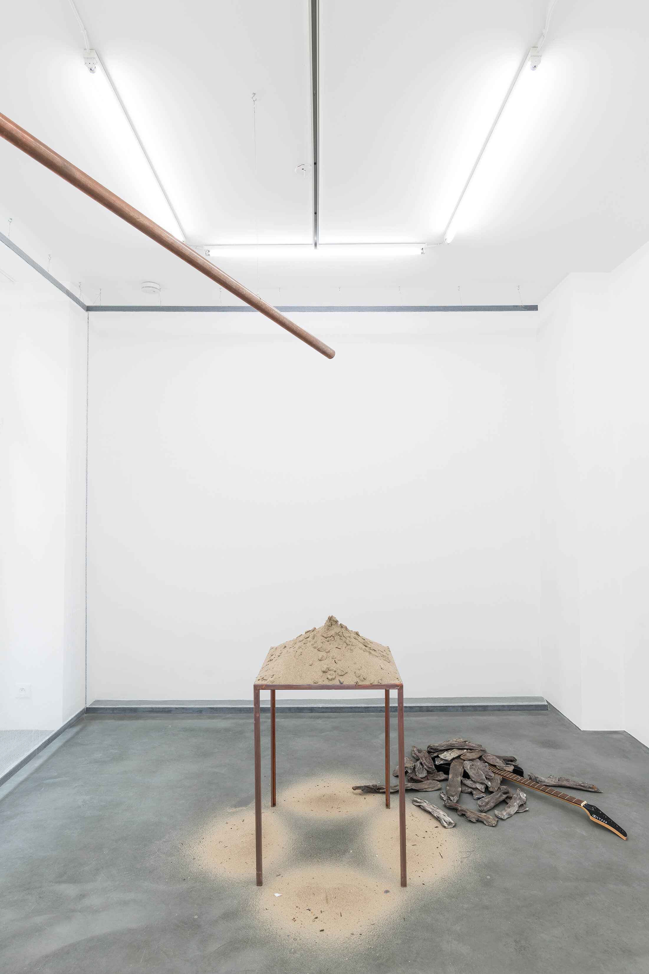 Katinka Bock, April Table, 2019, copper, rainwater, sand, dimensions variable. And Too sad to tell you, 2019, bronze, broken electric guitar, dimensions variable