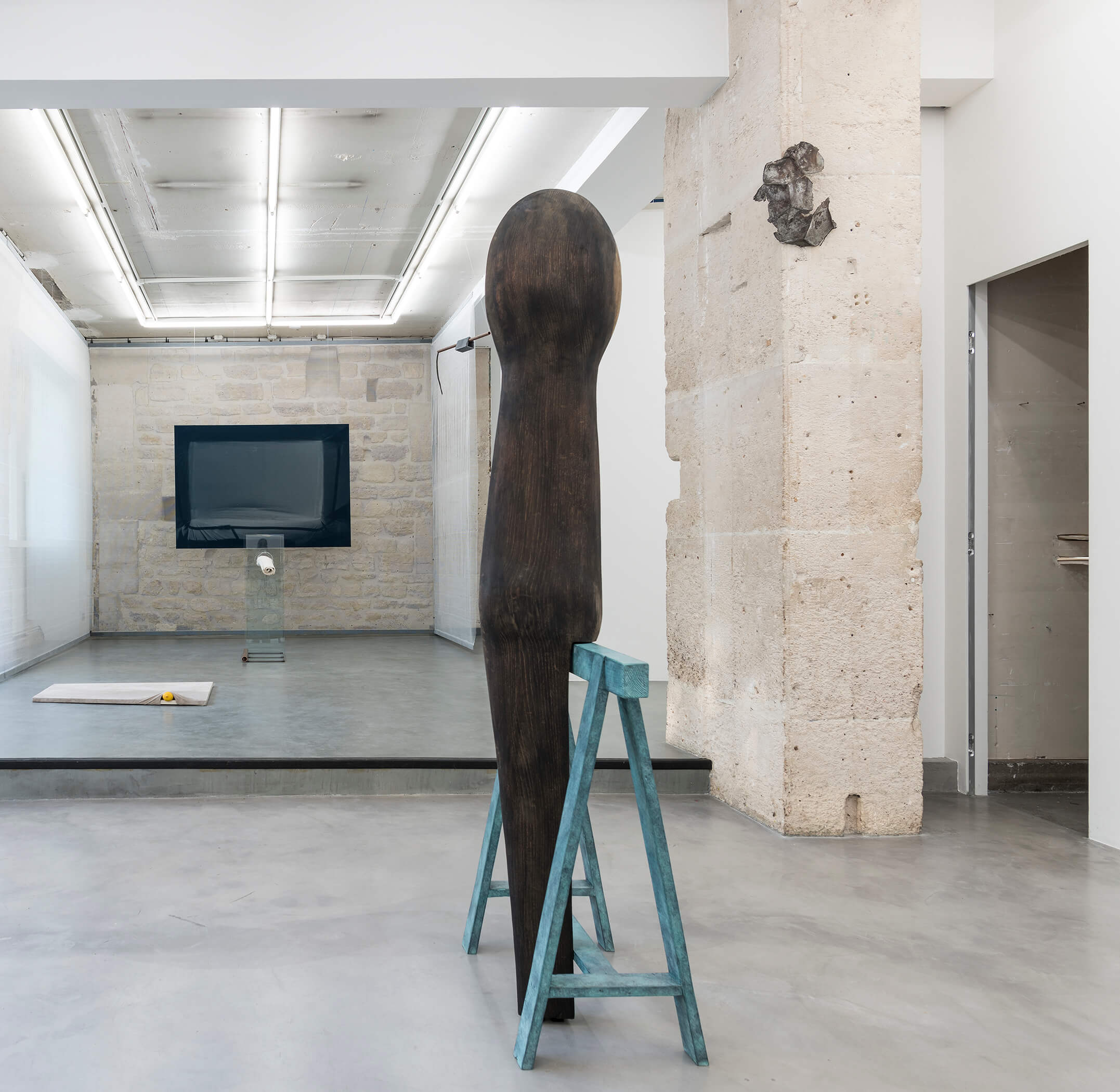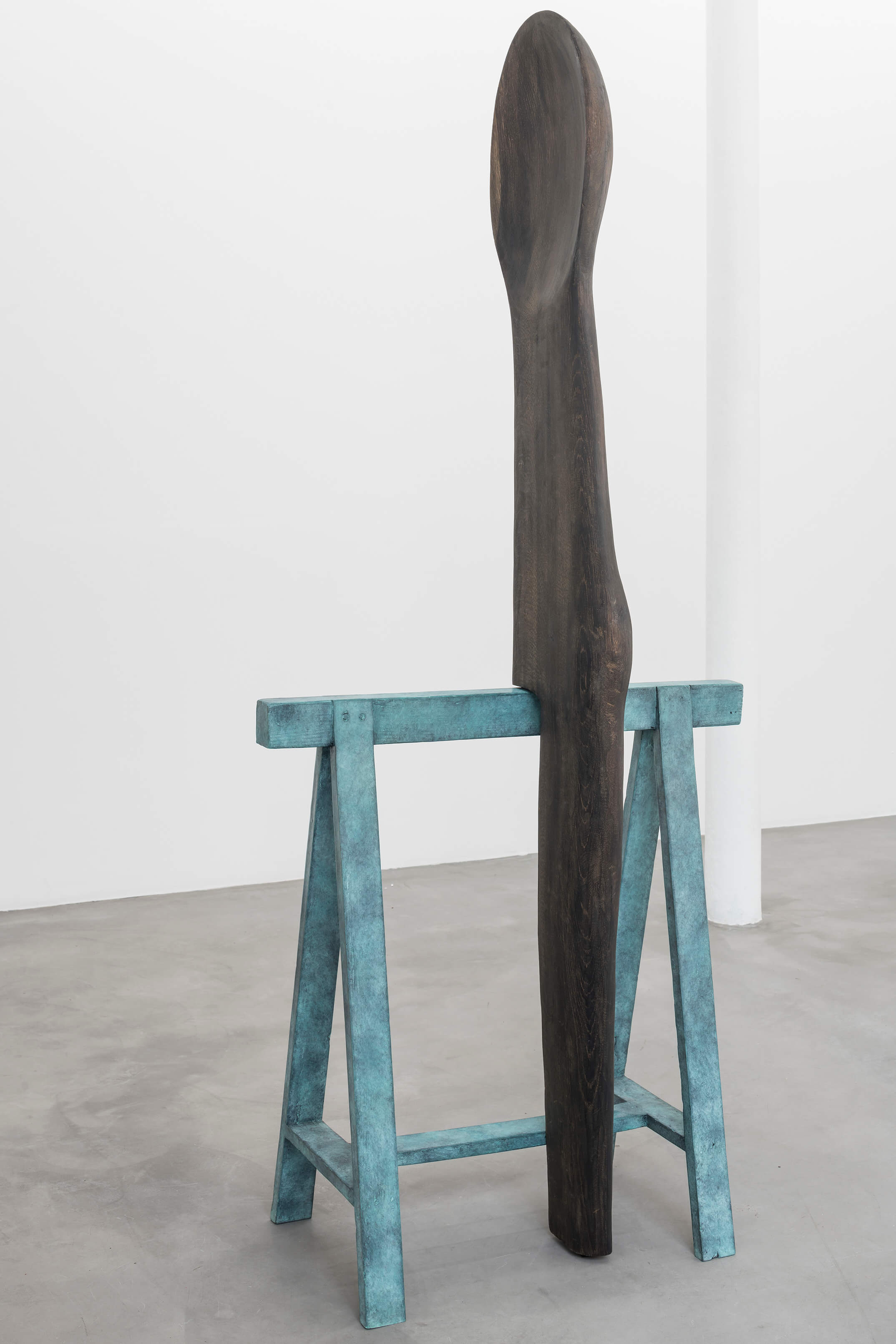 Katinka Bock, A and I (Ahab's sister) 2019 oak wood, bronze H 182 x 37.5 x 77.5 cm (overall) oak wood: H 182 x 26 x 10 cm bronze sawhorse: H 82.5 x 37.5 x 77.5 cm