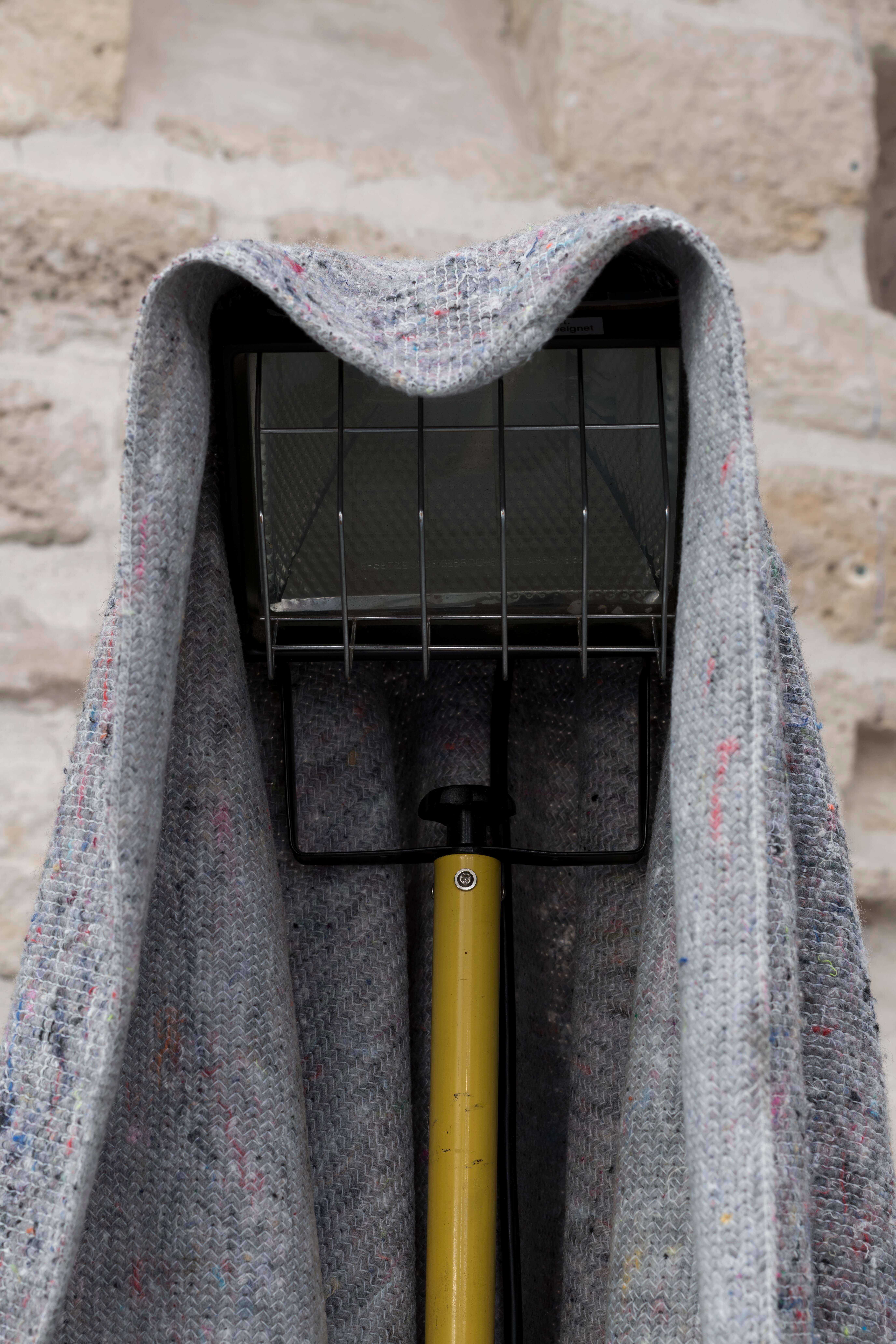 Hans Schabus, November Self, 2017, (detail), spotlight with tripod, packing blanket, Vienna Secession member card, 186 x 69 x 65 cm