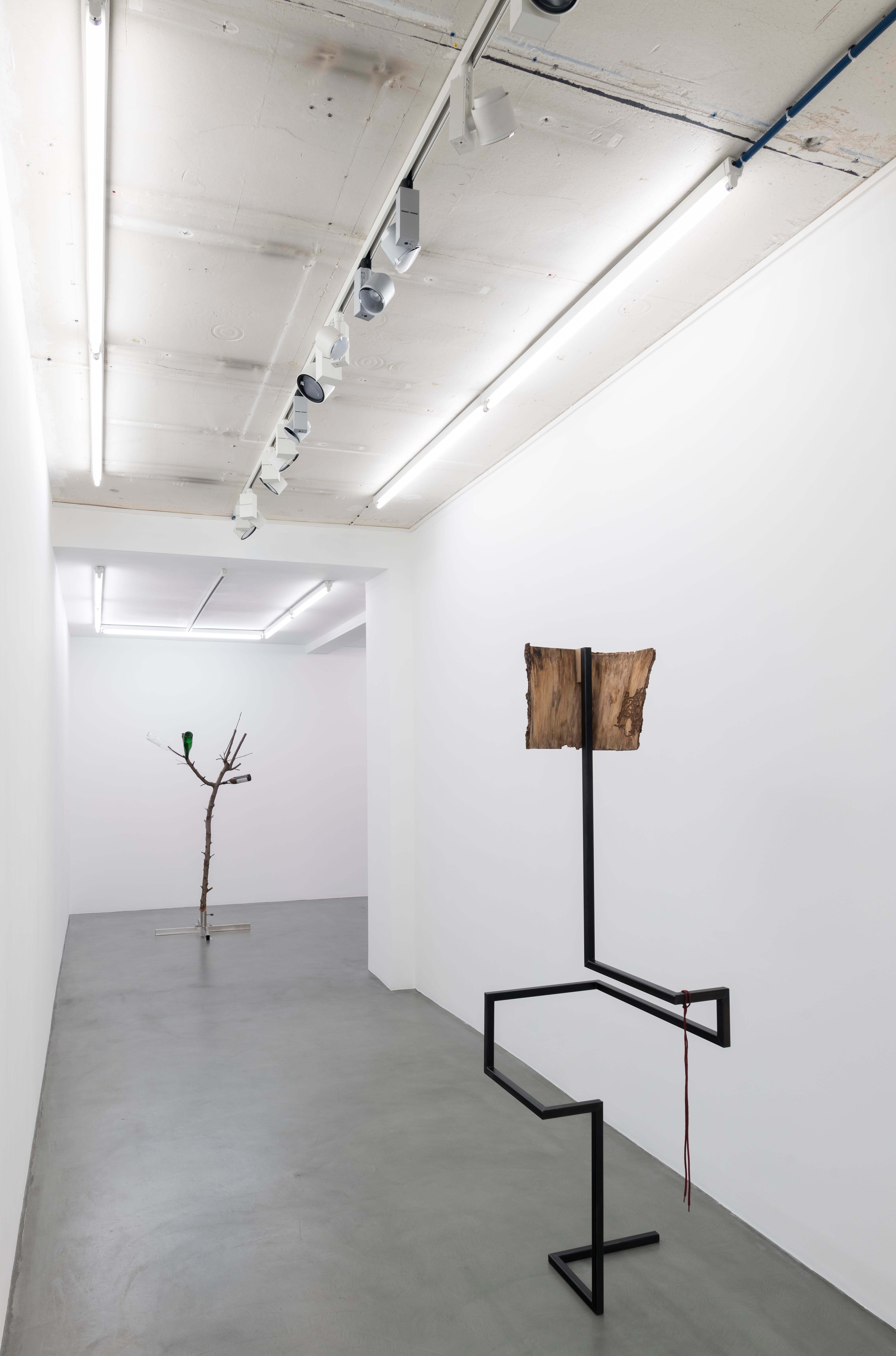 Hans Schabus, June Self, 2019, steel, bark, lace, 186 x 63 x 58 cm. April Self, 2017 umbrella base, branch, glass bottles, 186 x 100 x 102 cm