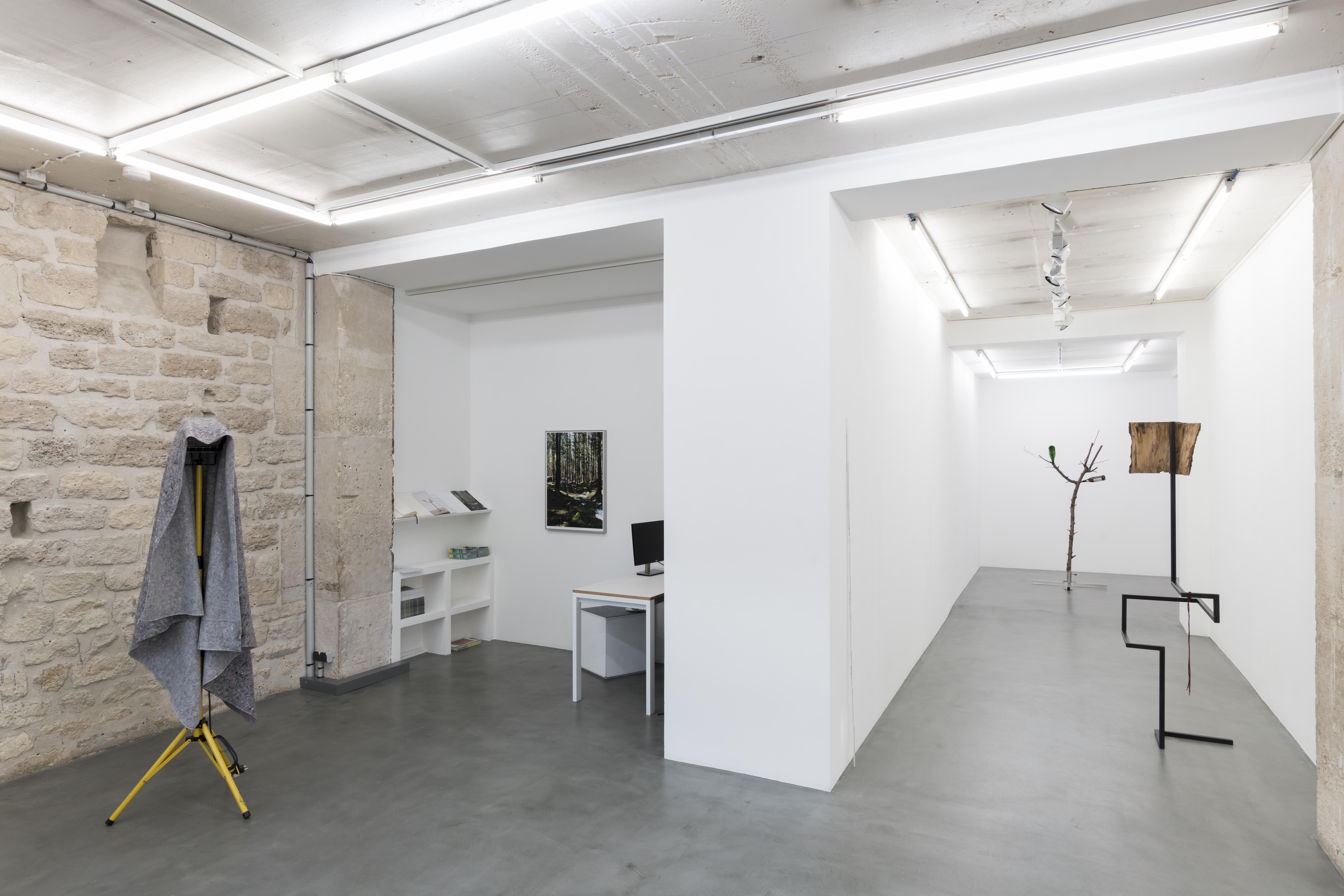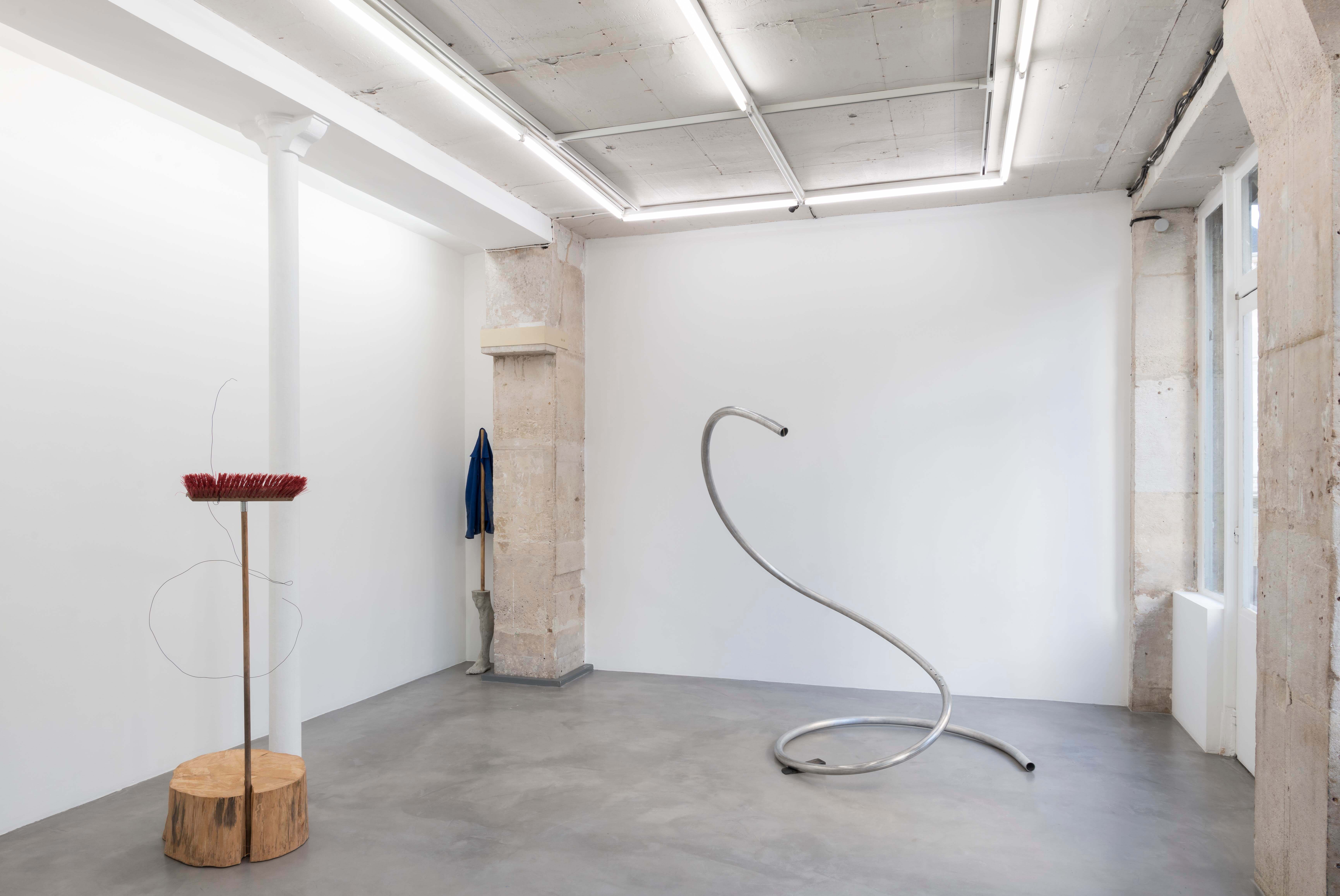 Hans schabus, December Self, 2017, (detail), tree trunk stump, broom, iron wire, 186 x 58 x 66 cm. May Self, 2017, concrete casting, broomstick, work jacket, 186 x 37 x 39 cm. March Self, 2017, wax, aluminum, match, 186 x 166 x 160 cm