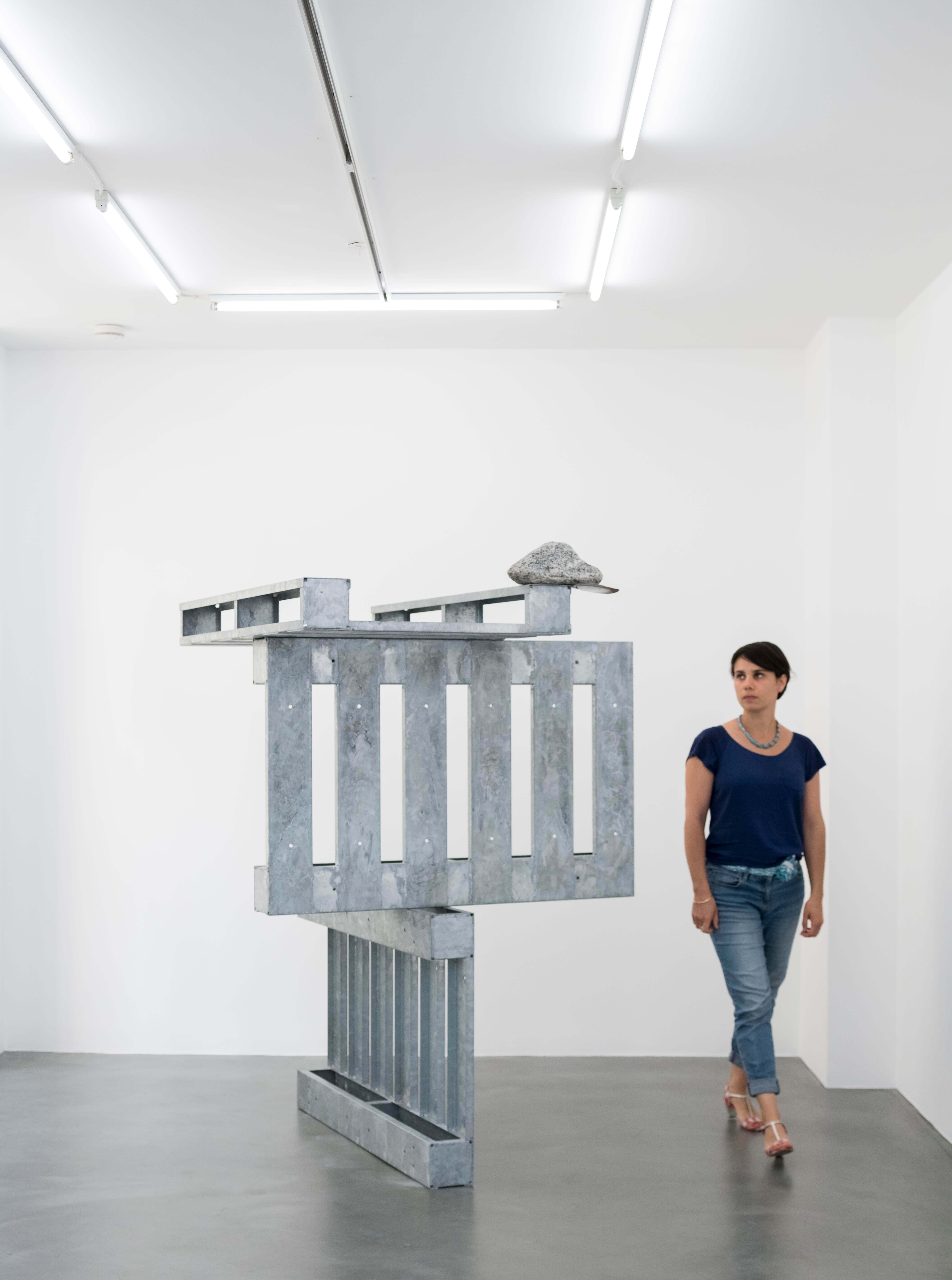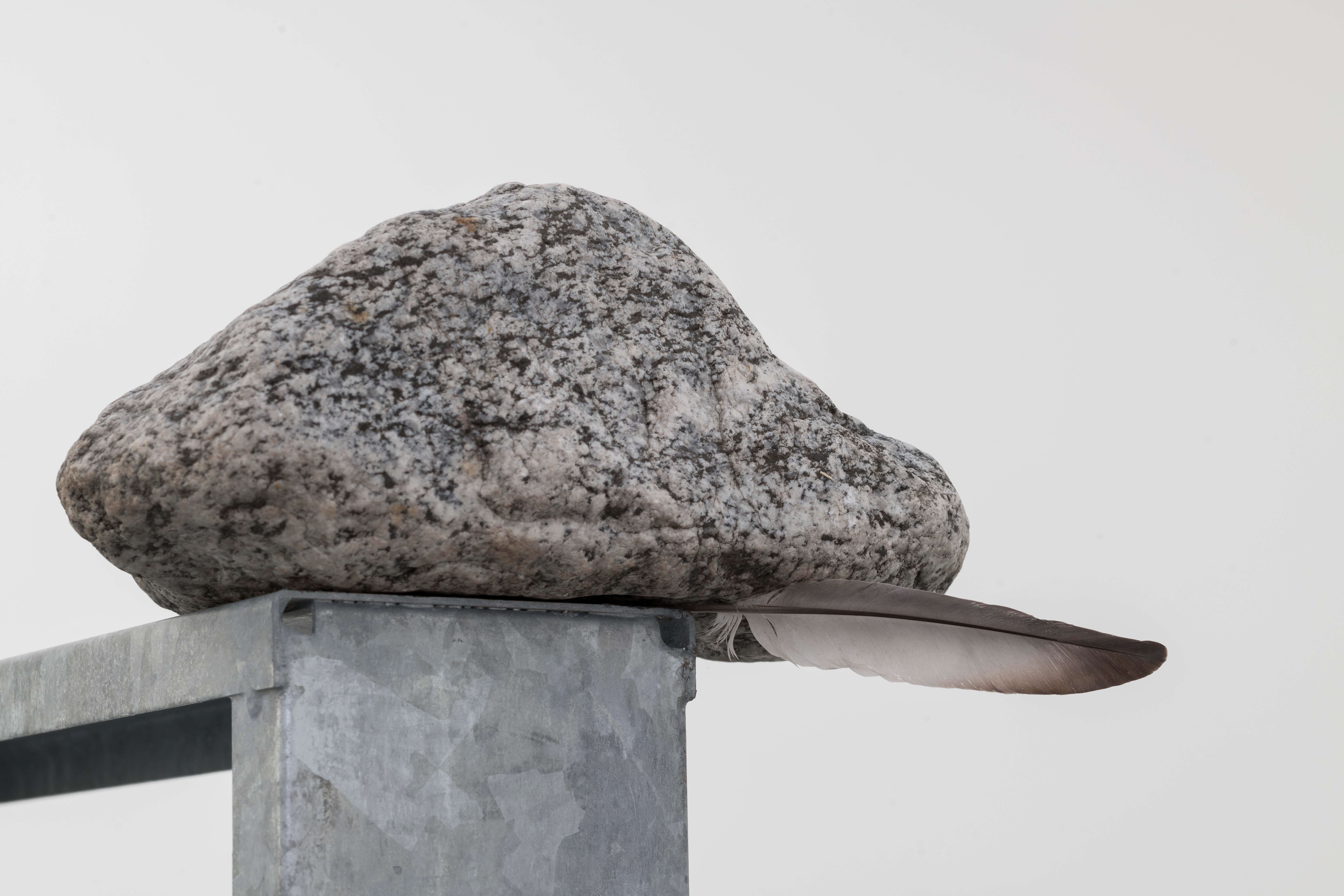 Hans Schabus, October Self, 2017, steel pallets, stone, feather, 186 x 125 x 147 cm
