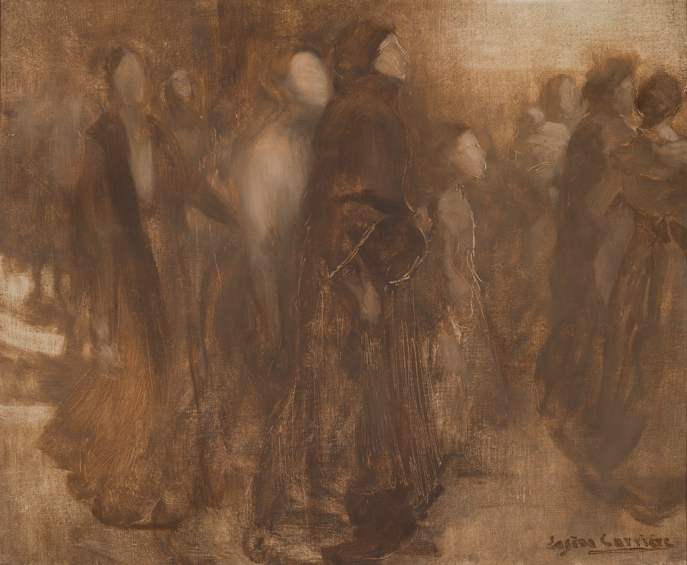Eugène Carrière’s art was recognised and appreciated in his time, the period characterised by the realistic painting of Courbet and Bastien-Lepage, the so-called academic painting represented by Gérôme and Bouguereau, at the same time as Impressionist art, Degas and the movements that followed in succession up until the advent of Symbolism. Eugène Carrière’s work was in a completely different register: very narrow, intimate, primarily made up of affectionate representations of his family, portraits, a series of unrecognisable landscapes and a handful of still lifes. Nothing of the fresco, no history painting, no epics, no grandiosity, but rather the figure and the feeling as an obsession. A style, always the same, a palette without color, restricted to earth tones, using only chiaroscuro to shape the forms, which would gradually become more blurred. At the risk of abstraction. A lean, fluid material, quick brushwork, broadly applied, which eliminated details with no concern for description. Basic compositions, reduced to the essential, a series of figures drawn from the depths and removed from any form of narration.
