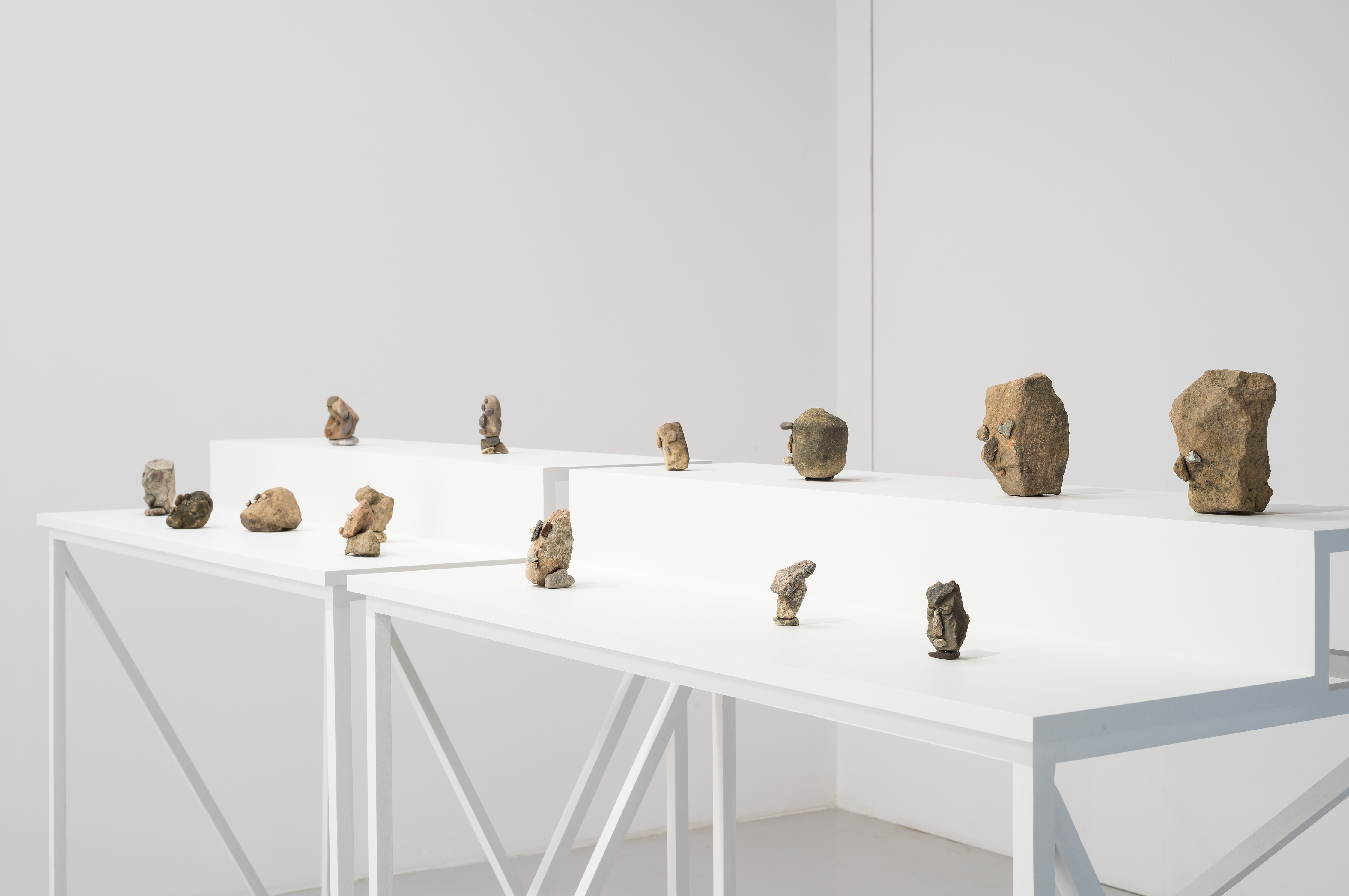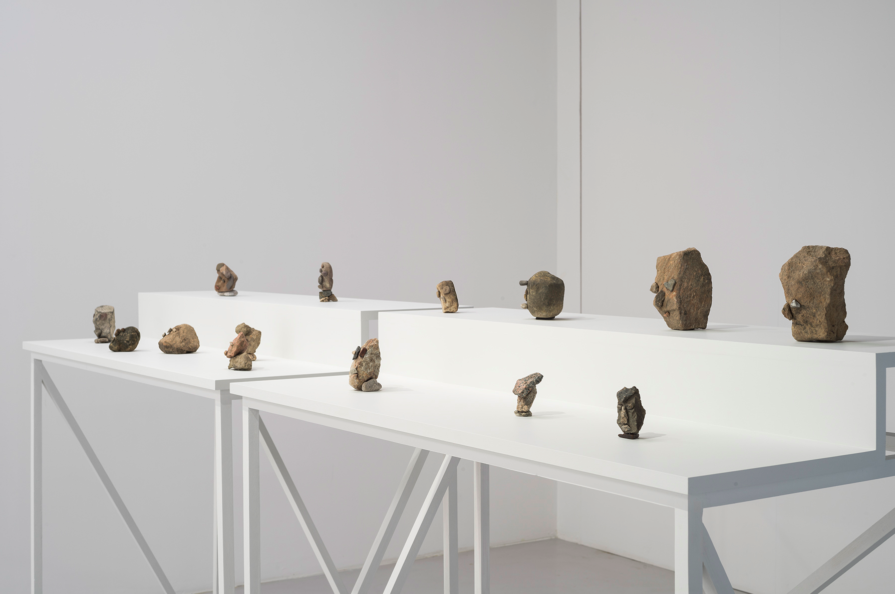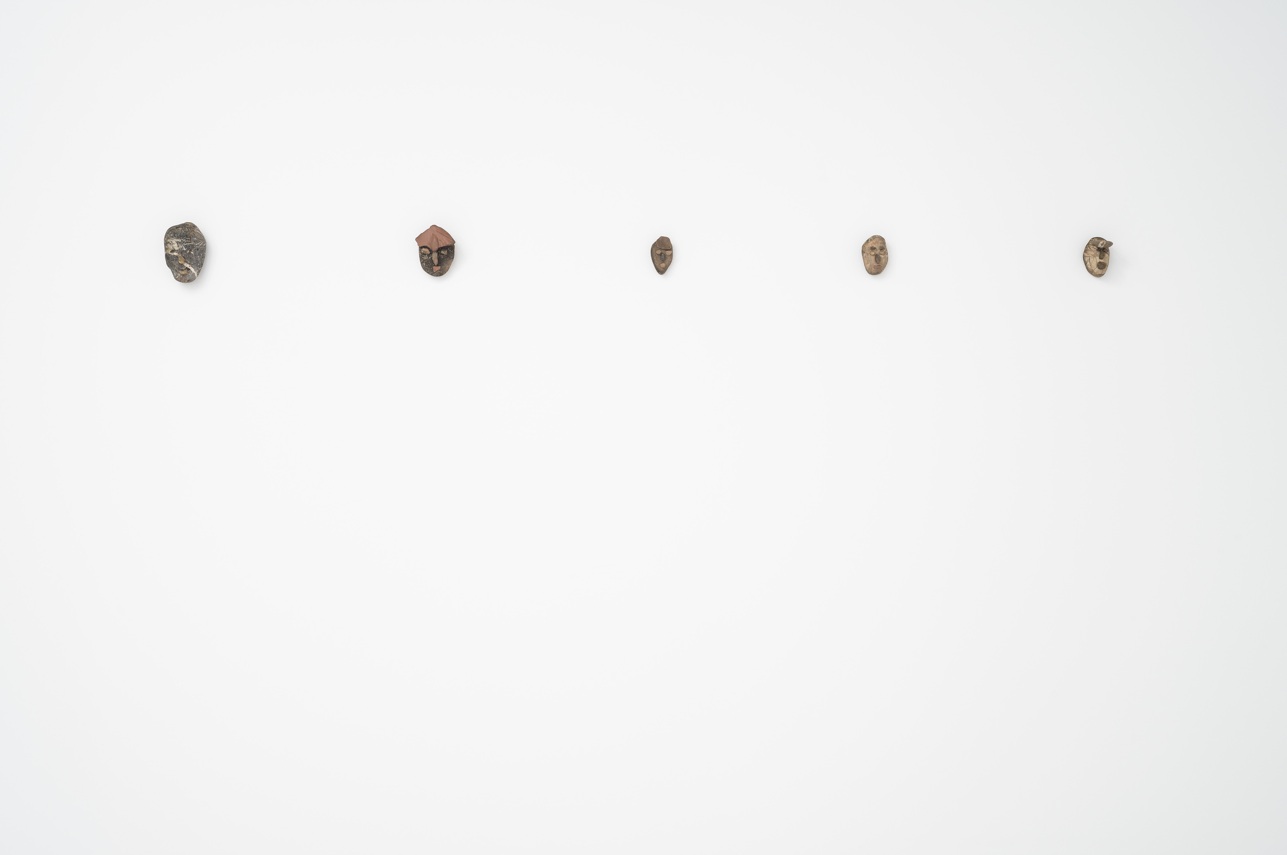 So the camellia flowers from the garden of Villa Aldobrandini are hidden between the bodies, behind the cloud of flowers in the Pavilion of Wild Pinks (2021) drawing, and the pyramid of Cestius appears in the middle of the architectural forms of Now and the Past (2021): two Roman remembrances captured by the artists. Behind the masks of characters or landscapes, inspired by the pandemic in 2020, and worn during the performances, we discover «accumulated information and inspiration,» as the duo puts it, the memory of the subject and the potential of a double, screens and interfaces. L’esprit de notre temps (video, 2020-2021) bears witness to this use of the mask and the relationship between the artists and their environment, here the Roman city. Finally, behind the assemblages of stones, whose titles often evoke their original site, the relationship of the artists to their environment is expressed once again, as well as a feeling of spontaneous recognition, a figural presence that crisscrosses their entire practice, between stylised bodies and carnivalesque faces. This imaginary projection by the artists reflects their embodied memory of the body and the subject, and, in so doing, a recognition of otherness, this “otherness [that] is experienced by passing through gestures, by an incorporation,” when “bodies seem to seek a beyond-gesture in a confrontation with the elements of nature, objects, other bodies” (Anne Creissels, 2019). However, about it is less a matter of confrontation than of attention to external elements.