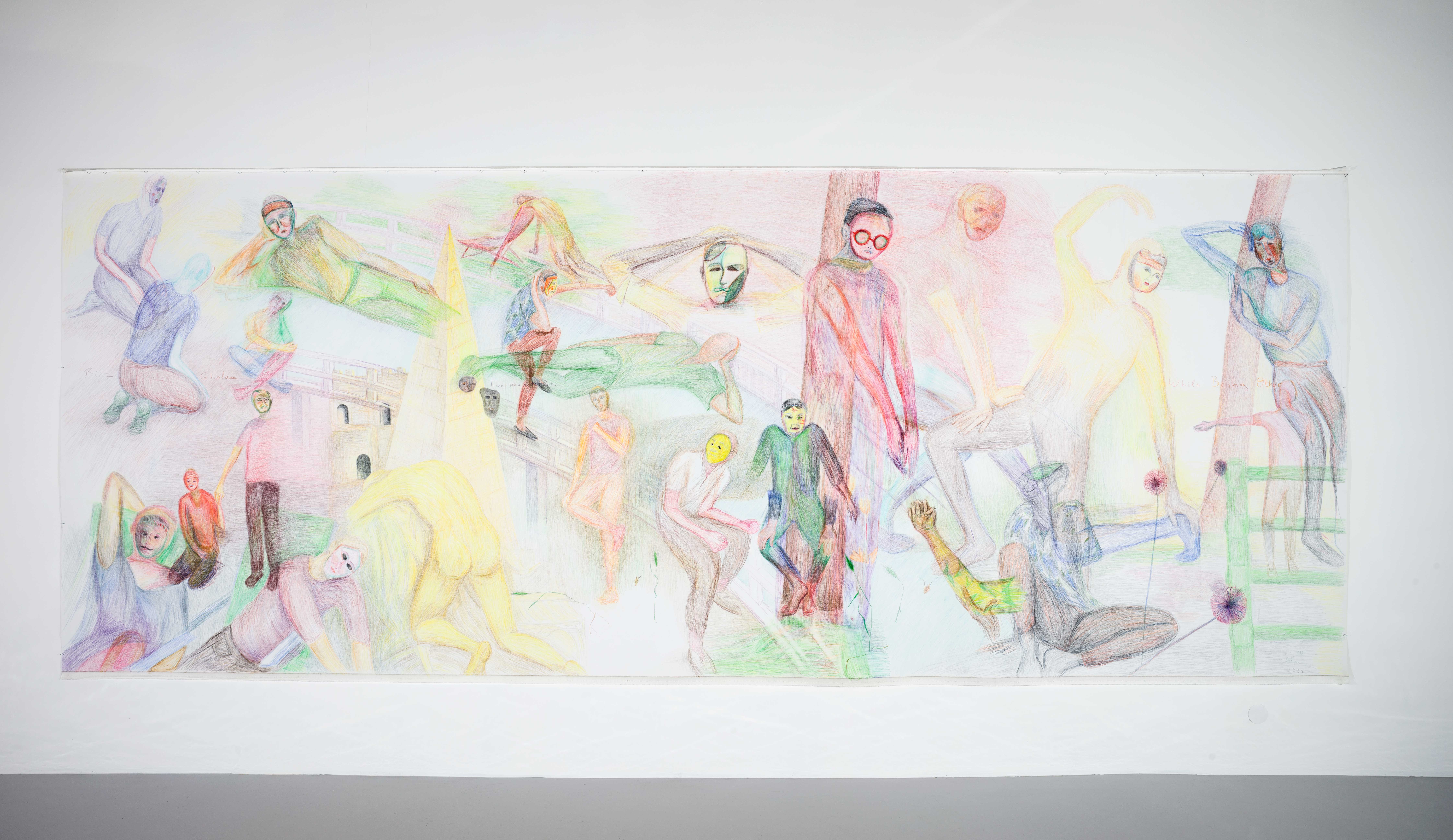 Prinz Gholam is a duo of artists who have been working together since 2001. Their work hides as much as it reveals, superimposing historical, academic and media references. Although their common practice is based on performance, as a medium and process, their output is multidisciplinary, also including videos, drawings, photographs, and object installations. These artistic practices converge around a common approach of the body and the gesture. The spontaneity of movement is reflected in their performances as well as in their drawings and assemblages of stones. Their drawing work connects hybridity and the performativity of bodies. Since 2020, the artists have given a more important place to the drawings, with large formats of coloured pencil on canvas, where the figures gather, and seem to come alive in their environment. Some of these drawings are also related to other projects or performances, such as Now and the Past (2021) : having been a prefiguration, an exhibited work, it now is a remembrance of their project While Being Other, which was presented at the Mattatoio in Rome in 2021. Thus, these canvases offer spaces for simultaneous creation and the free expression of their choreographic repertoire. They become “fields of relationships” for the artists, in the same way as their performative actions. This creative spontaneity enables a spontaneity of the imagination. However, each work presents an assemblage of historical and media references, subjective, shared and concentrated, resulting from a long process of observation and dialogue. As both a personal experience of the body and highlighting an socially-constructed cultural imagination, the gesture encounters the construction of the image in Prinz Gholam’s work, thereby questioning its paradoxical status.