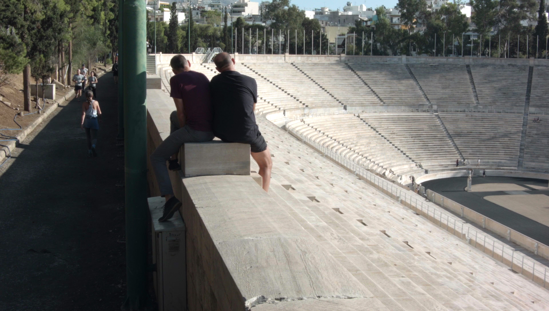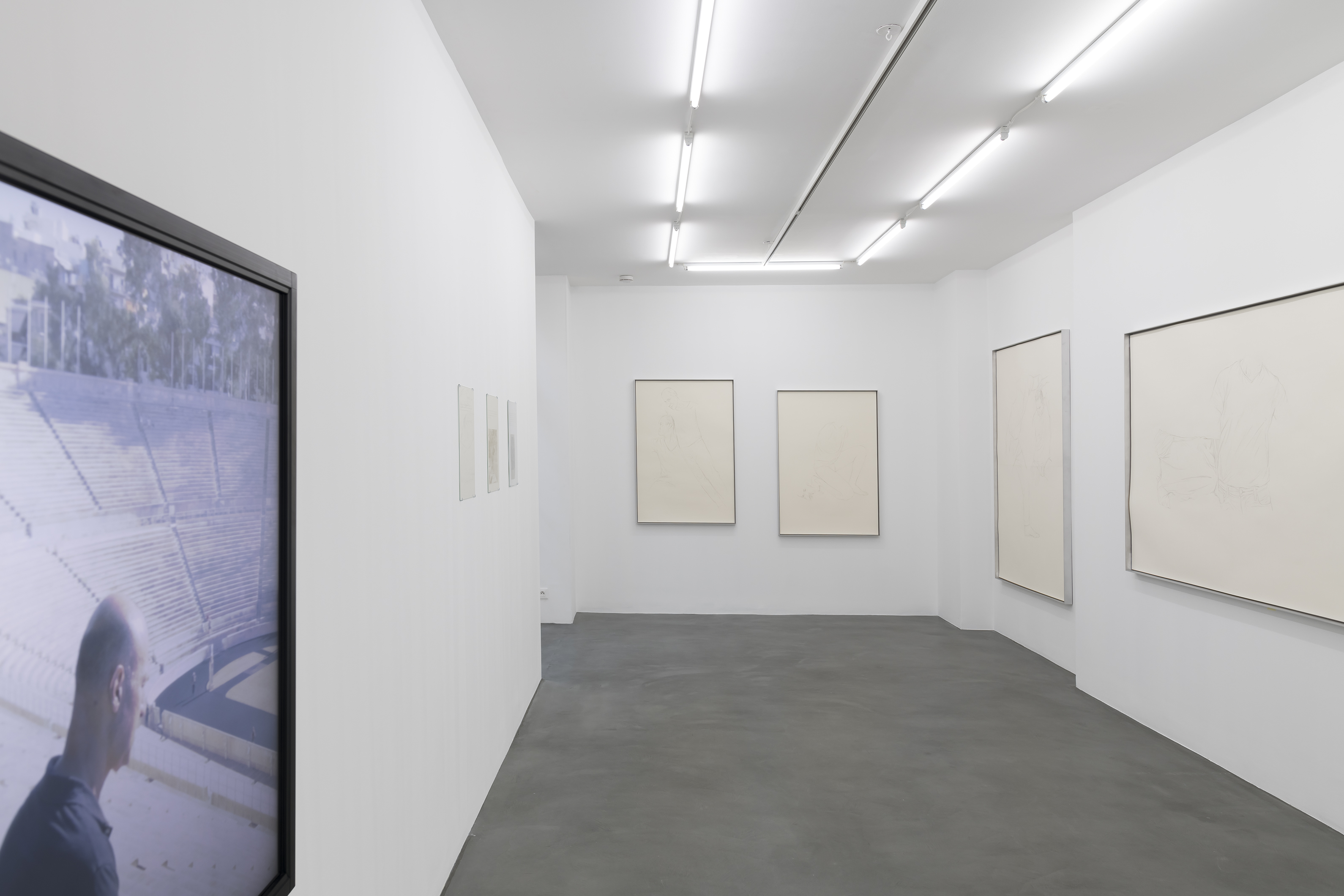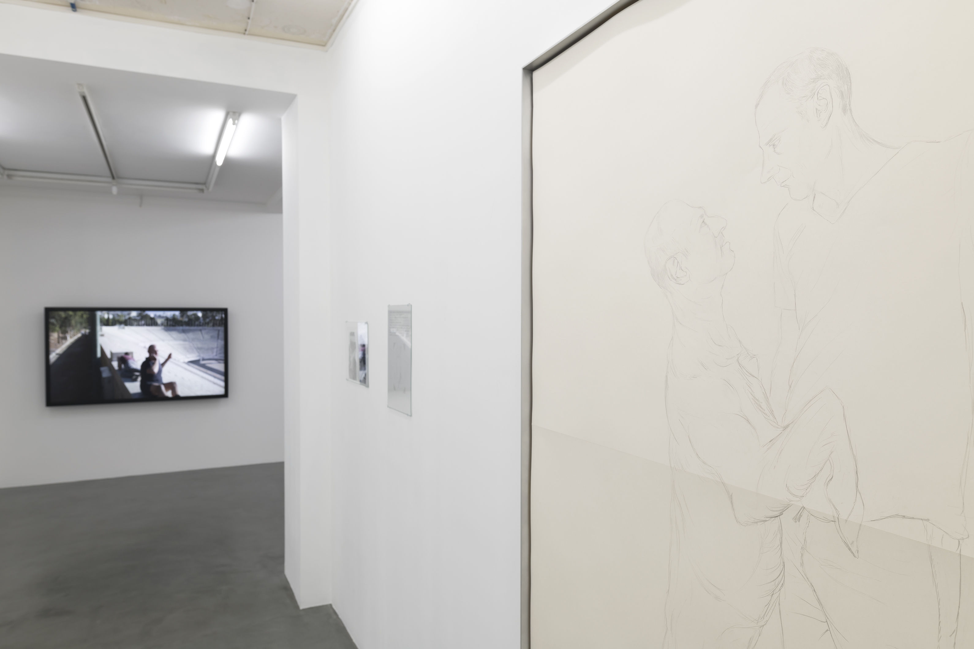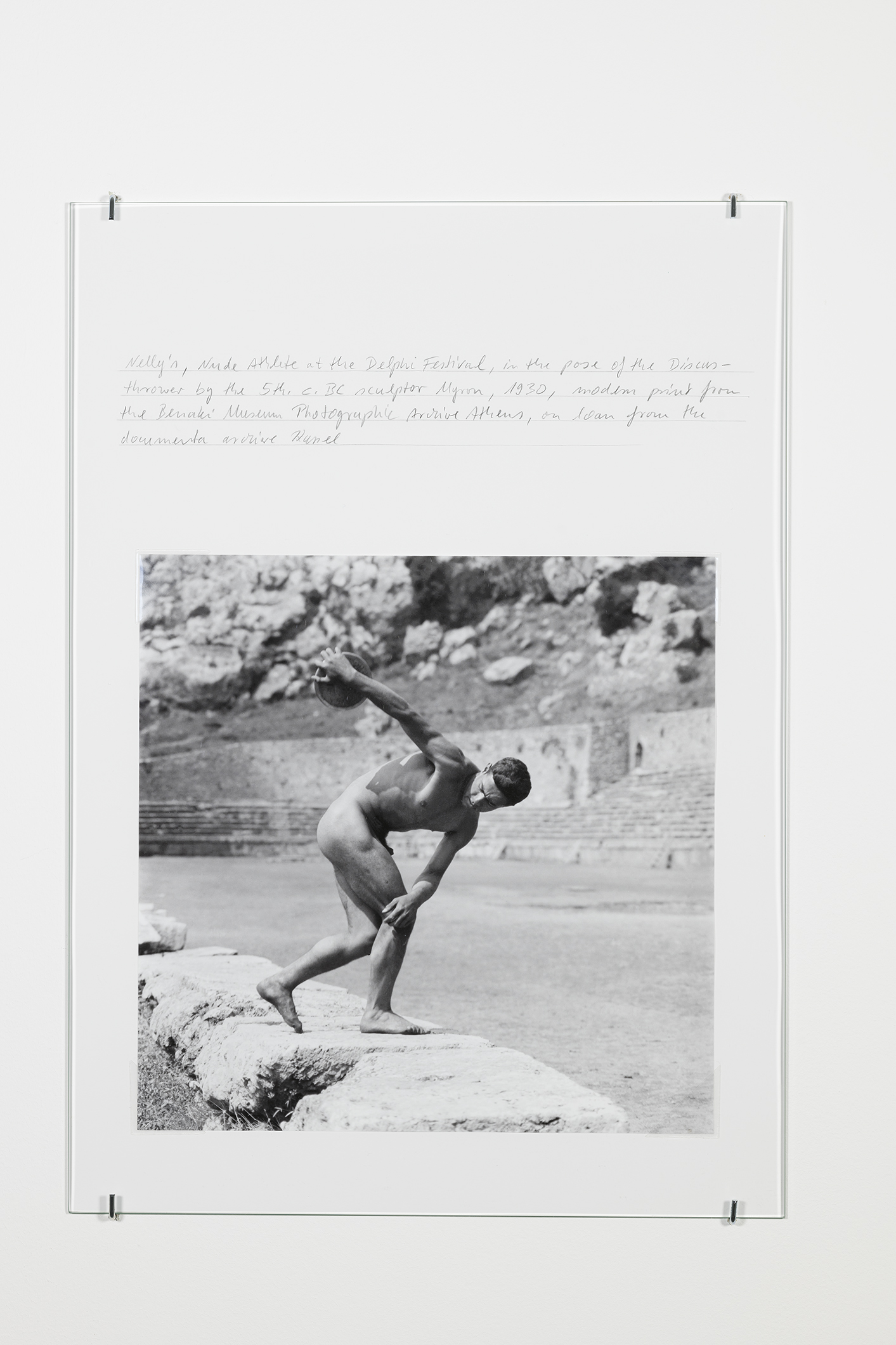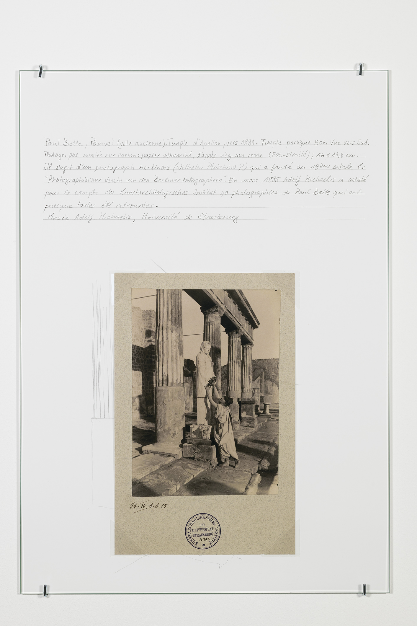 Prinz Gholam, Speaking of Pictures, drawing for display of Paul Bette Nécropole du Céramique / monument funéraire de Dionysos de Kollytos 1891-1835, 2017, pencil and adhesive mounting corners on paper, 42 x 29,7 cm.